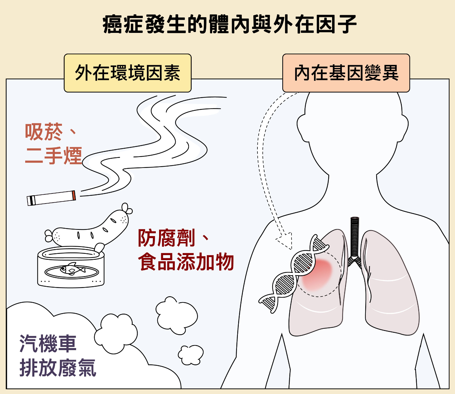 但基因藏在細胞內好好的,為什麼會突變呢?陳玉如解釋:「有些是細胞本身造成的,像是 DNA 修復錯誤等內生性因素,有些則是紫外線、抽菸等外在的致癌物造成的,如果要了解非抽菸病人的致病原因,就要去找到體內和外在的致癌因子。」