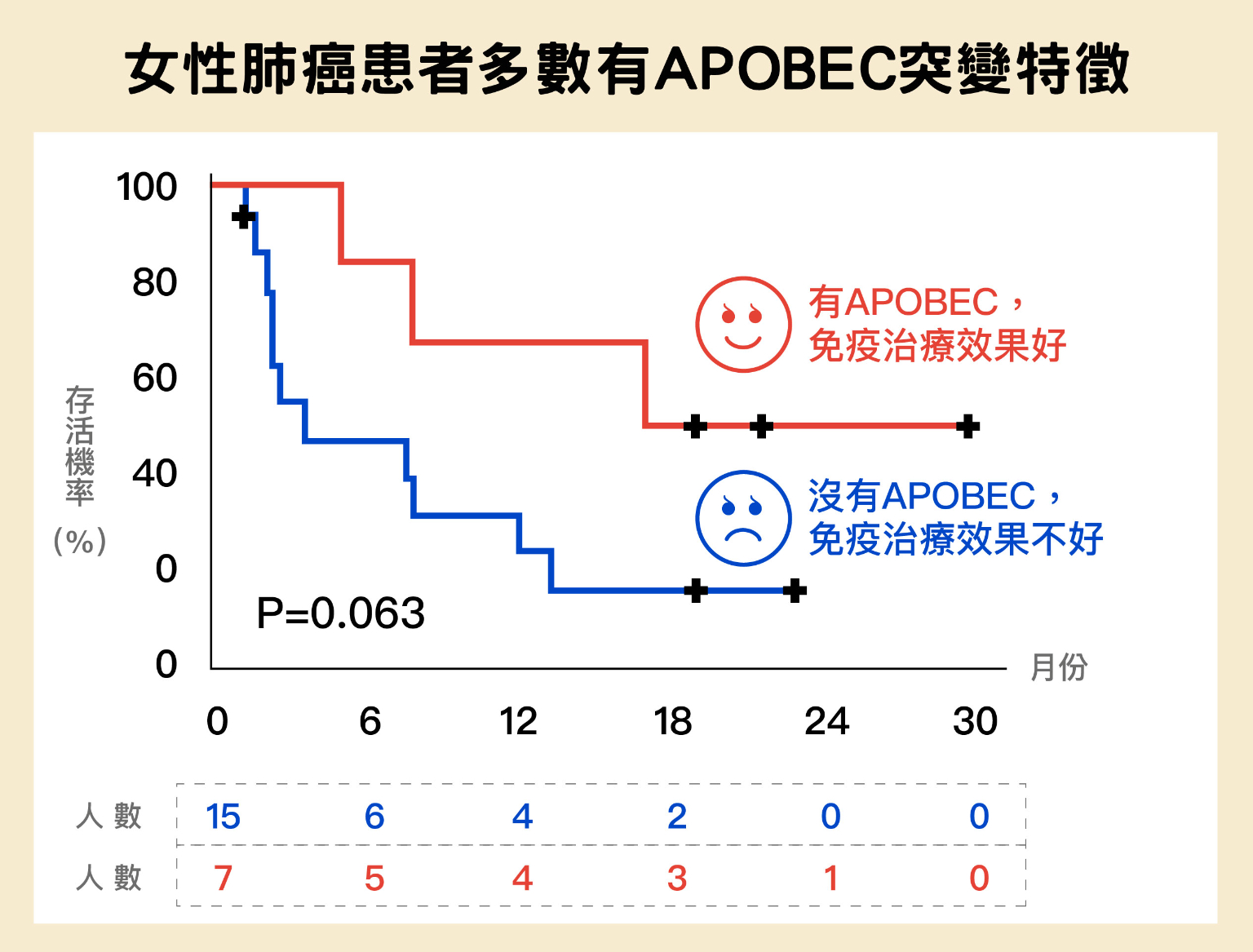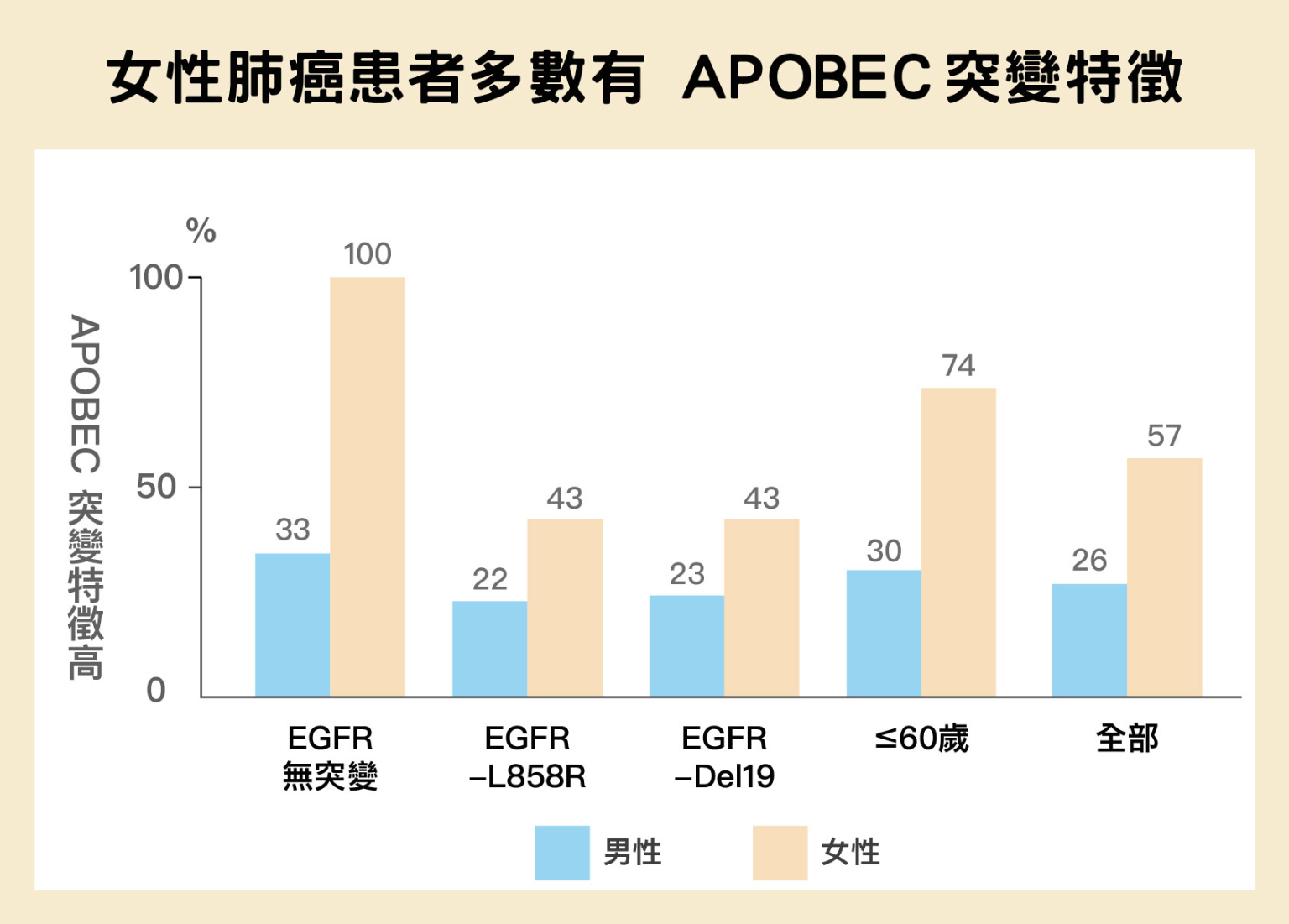 在上述的五大突變特徵中,非吸菸患者最多的是第二型「APOBEC 突變特徵」,尤其在女性患者身上更明顯,六十歲以下未吸菸的罹癌女性高達 74% 具有這種突變特徵;而 EGFR 基因沒有突變的罹癌女性,更是百分之百都有這種突變特徵。再加上女性患者體內 APOBEC 的濃度也比較高,研究團隊認為,APOBEC 造成的基因突變可能是引發女性肺癌的關鍵因素。