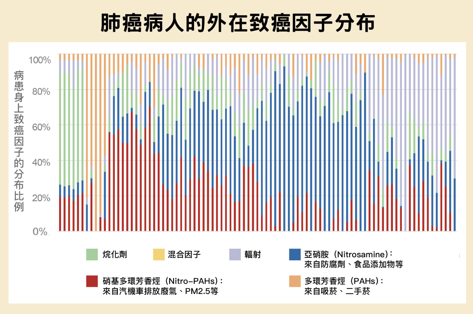 接著,研究團隊將找到的五種突變特徵,比對國外針對幾十種致癌物所建立的「癌症突變特徵資料庫」,尋找致癌的外在因子,發現有兩種突變特徵可能來自外在的致癌物,這些致癌物包括吸菸、二手菸、汽機車排放的廢氣、PM2.5、油煙,以及食品中的防腐劑、食品添加物等等。