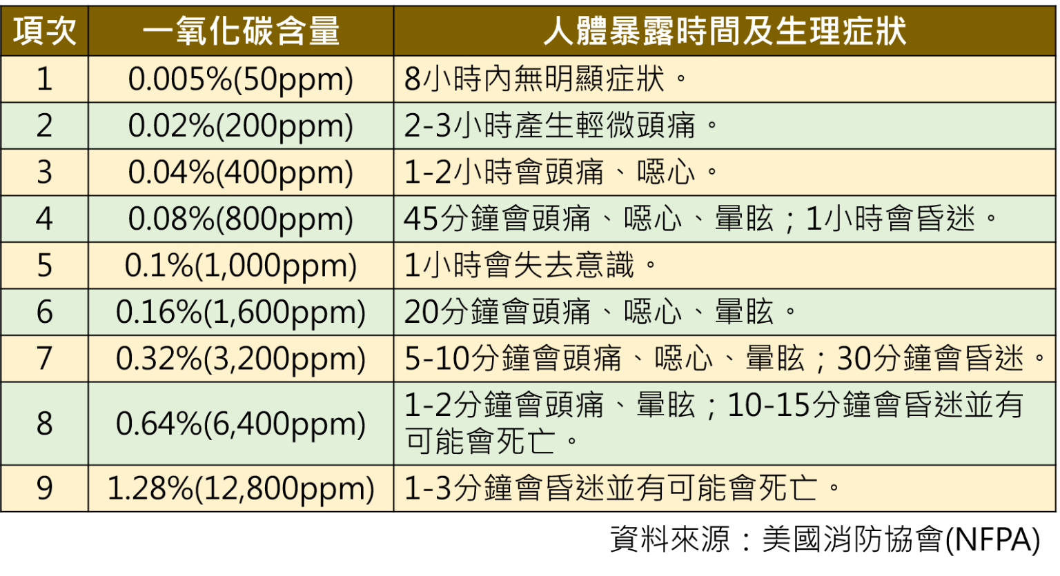 美國消防協會NFPA(National Fire Protection Association)編著之防火手冊,提出一氧化碳含量對於人體吸入時間及中毒症狀如下: