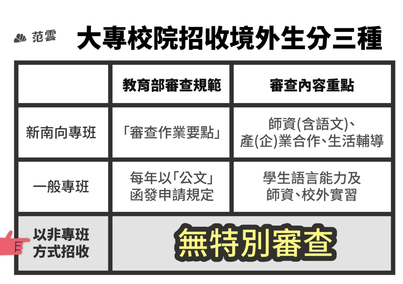范雲指出,監察院在2019年的調查報告早已指出,近年境外生淪為「學工」案例,均是以此類「非專班方式」招收,要求教育部應確實檢討督管機制,但教育部至今仍未改善。