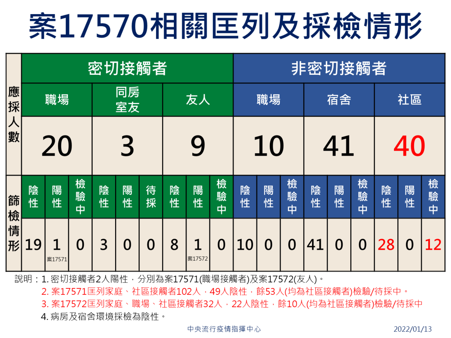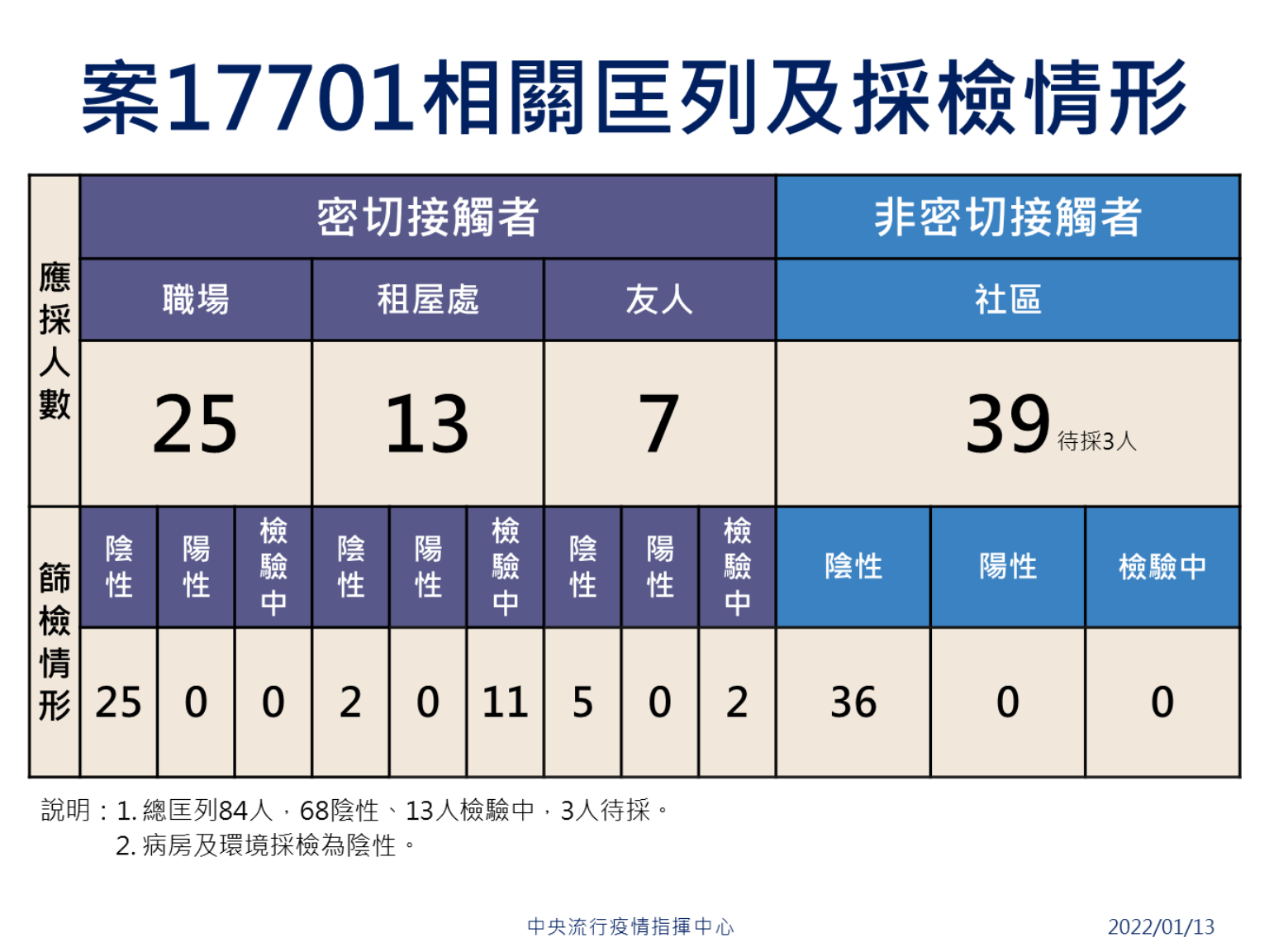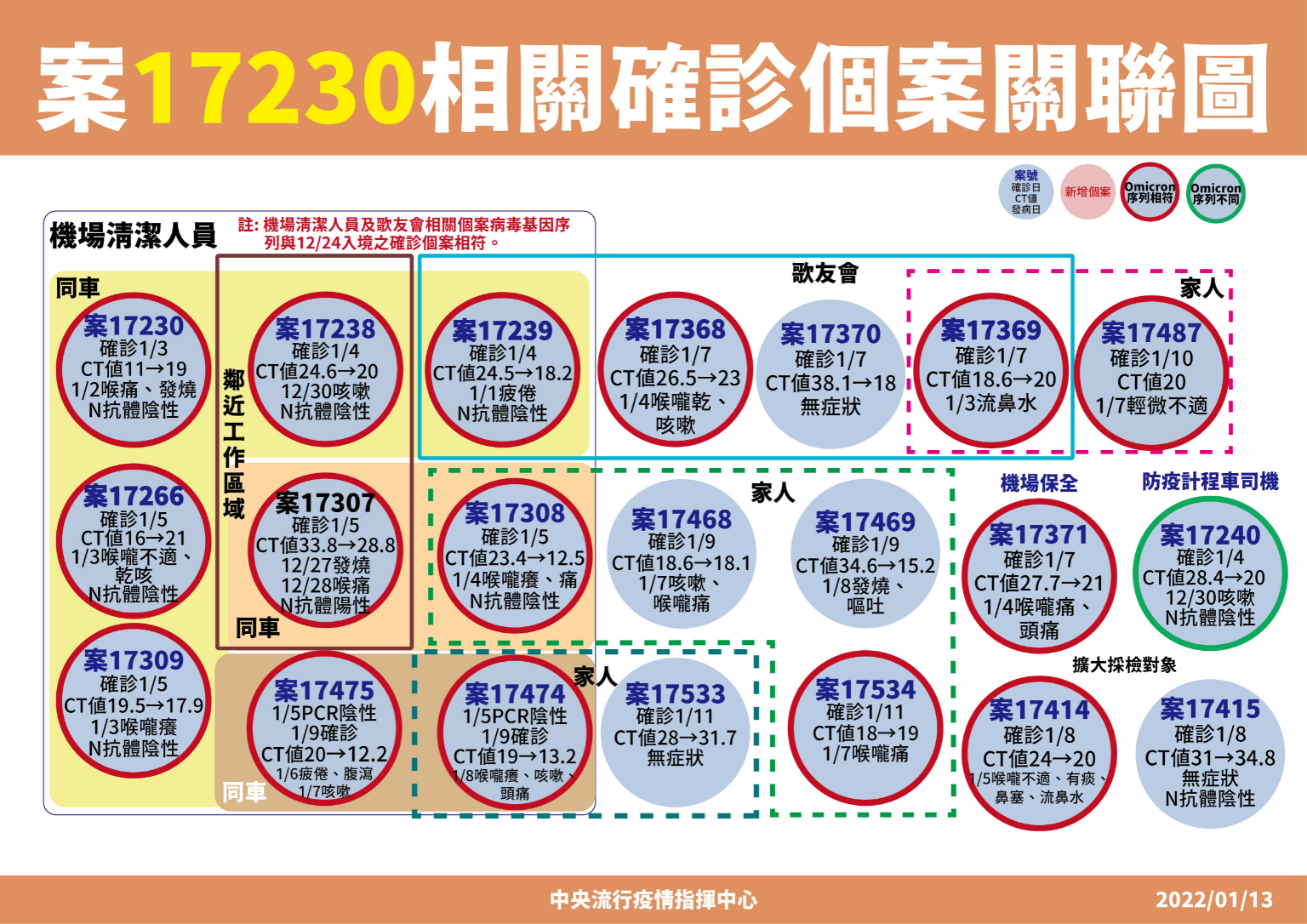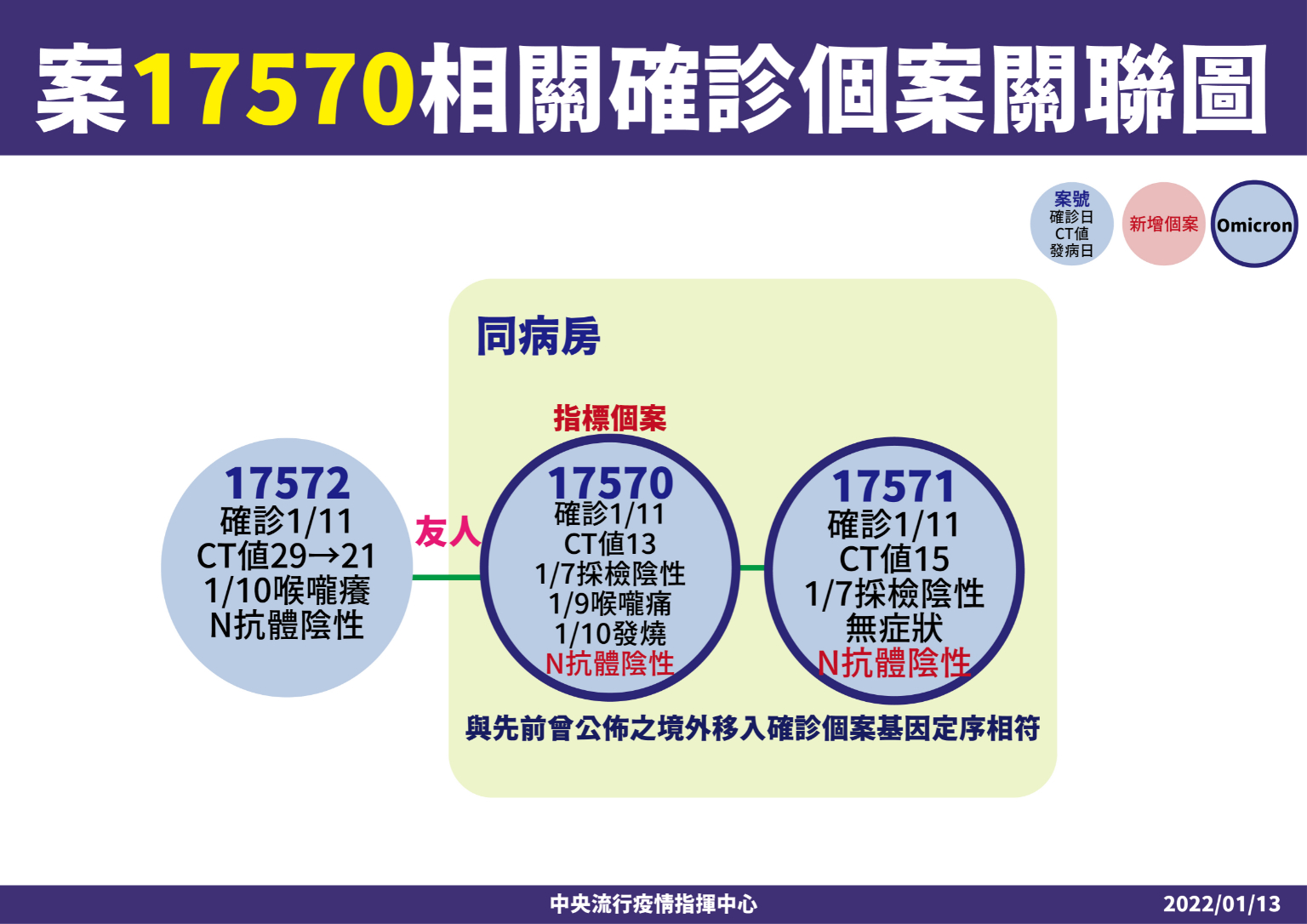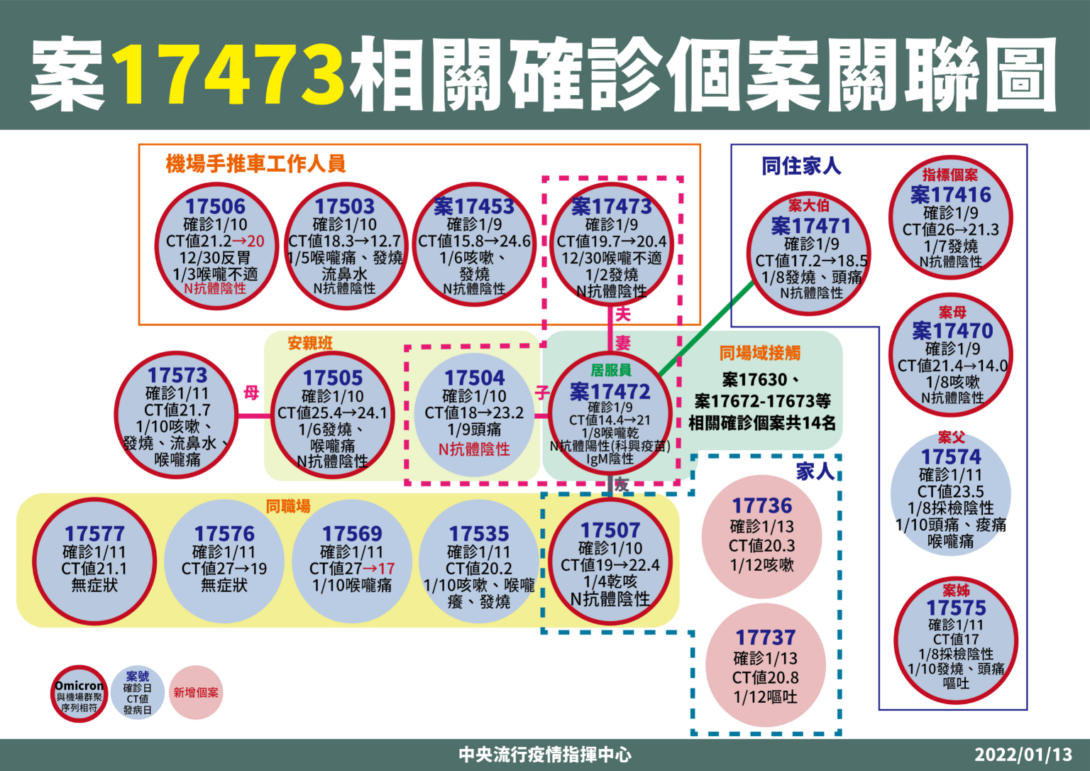 指揮中心說明,今日新增境外移入個案為17例男性、28例女性、6例調查中,年齡介於未滿5歲至70多歲,分別自美國(28例)、越南(3例)、法國、澳大利亞、菲律賓及英國(各2例)、阿拉伯聯合大公國、哥斯大黎加、瓜地馬拉、印尼、德國、孟加拉、丹麥、印度及義大利(各1例)移入;另3例調查中。入境日介於去(2021)年12月29日至今(2022)年1月12日;詳如新聞稿附件。