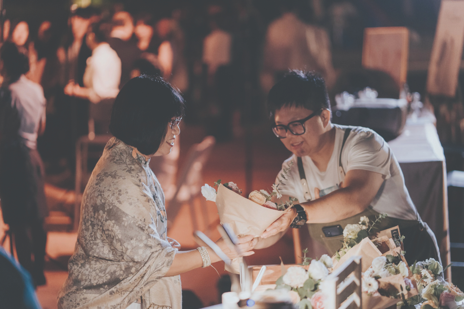 一場婚禮布置會用上非常大量的鮮花,典禮結束,大多數的鮮花會被丟棄,生命週期短暫,相當可惜。為了延續花禮的祝福,「薑薑小姐」不計成本地投入人力與時間,在婚禮中場開始收集花飾、逐一拆解,再重新組裝成小花束,在婚禮最後送給賓客。「賓客收到花束都很驚喜,不僅不浪費花材,更讓幸福感延續到家。」張穎成認為,雖然過程辛苦,卻能對環境和新人多盡一份心力,成就好事更開心。