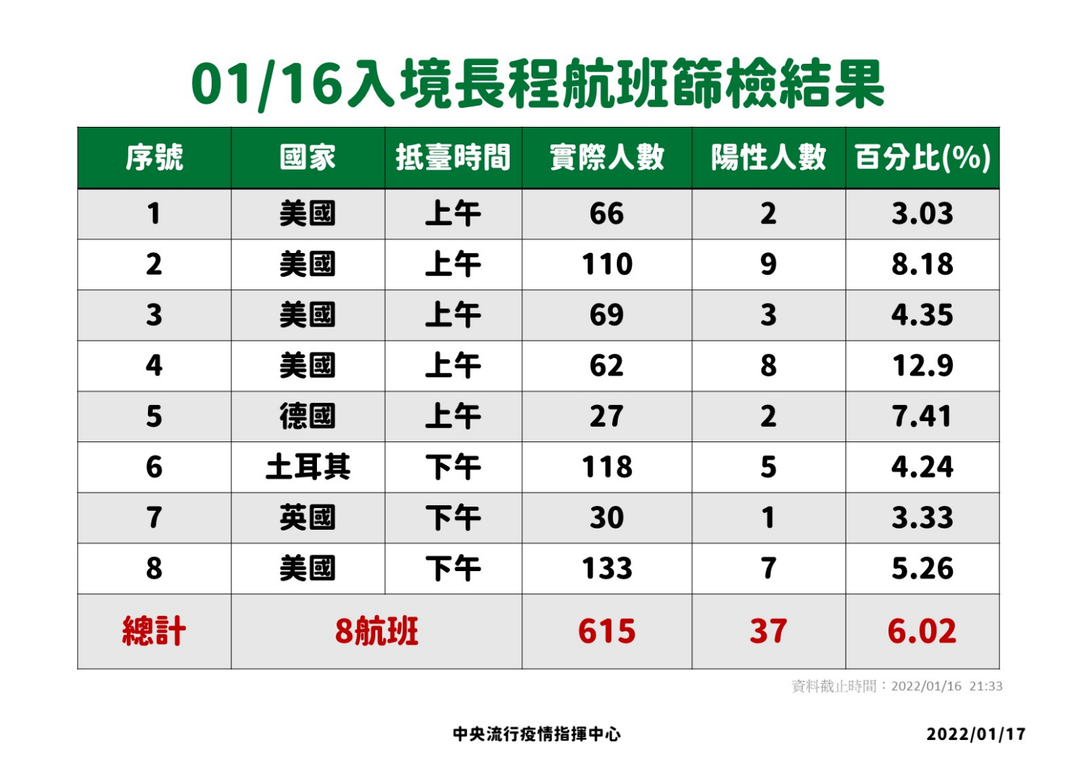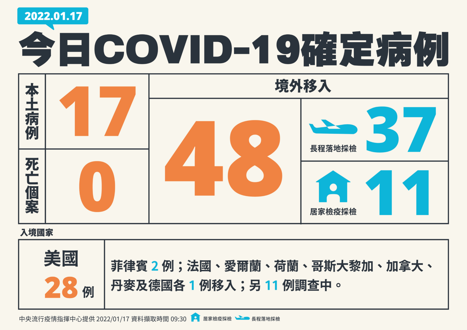 指揮中心說明,今日新增境外移入個案為28例男性、20例女性,年齡介於未滿10歲至50多歲,分別自美國(28例)、菲律賓(2例)、法國、愛爾蘭、荷蘭、哥斯大黎加、加拿大、丹麥及德國(各1例)移入;另11例調查中。入境日介於今(2022)年1月2日至1月16日;詳如新聞稿附件。