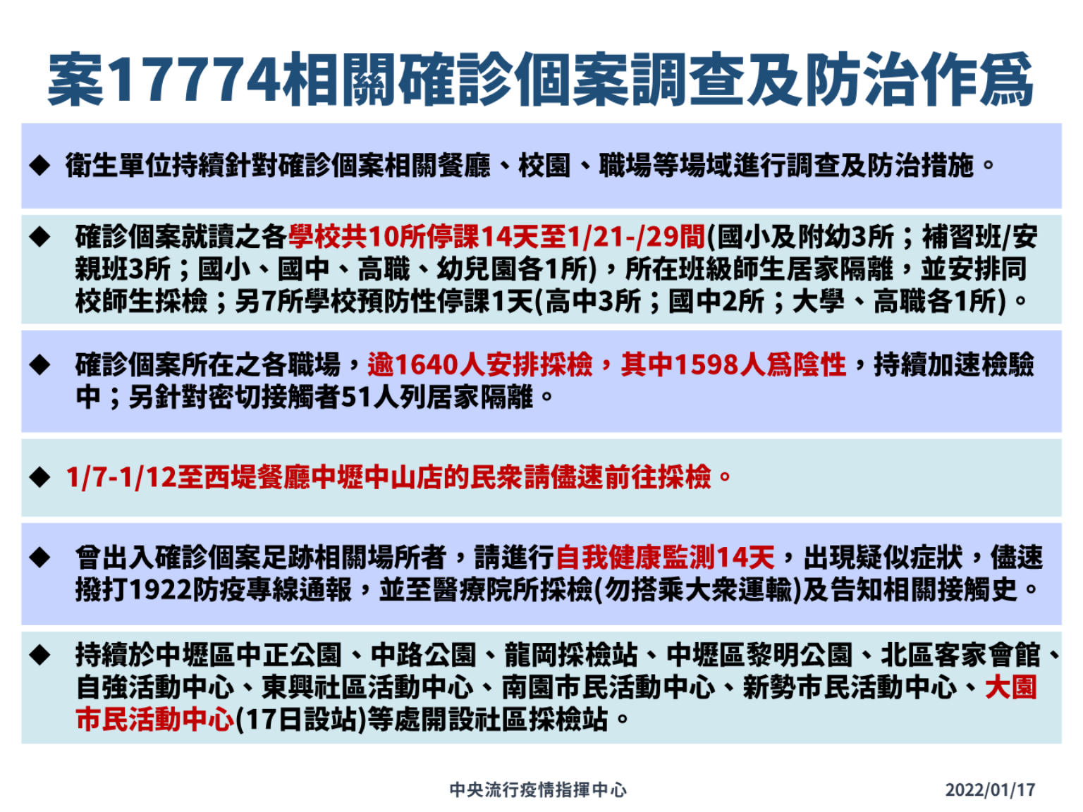 指揮中心再次呼籲,民眾應落實手部衛生、咳嗽禮節及佩戴口罩等個人防護措施,減少不必要移動、活動或集會,避免出入人多擁擠的場所,或高感染傳播風險場域,並主動積極配合各項防疫措施,共同嚴守社區防線。