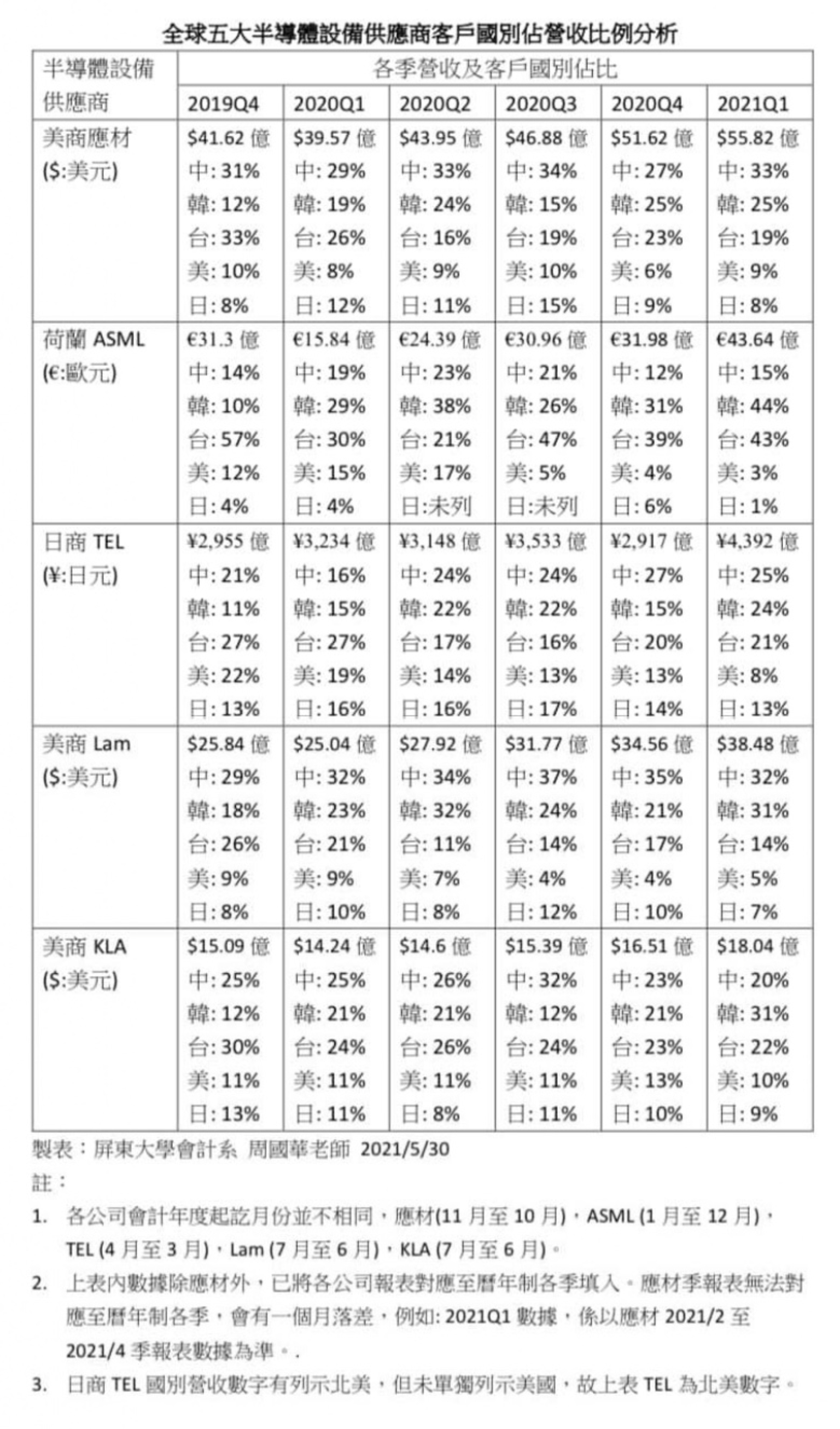 在日商TEL 部分,台灣有兩個季度佔比居第一、一個季度居第二、三個季度居第三。在美商Lam部 分,台灣有兩個季度居第二、四個季度居第三,是五大設備供應商中佔比較低的一家。在美商KLA 部 分,台灣在一個季度獨居第一、兩個季度分享第一、三個季度居第二。