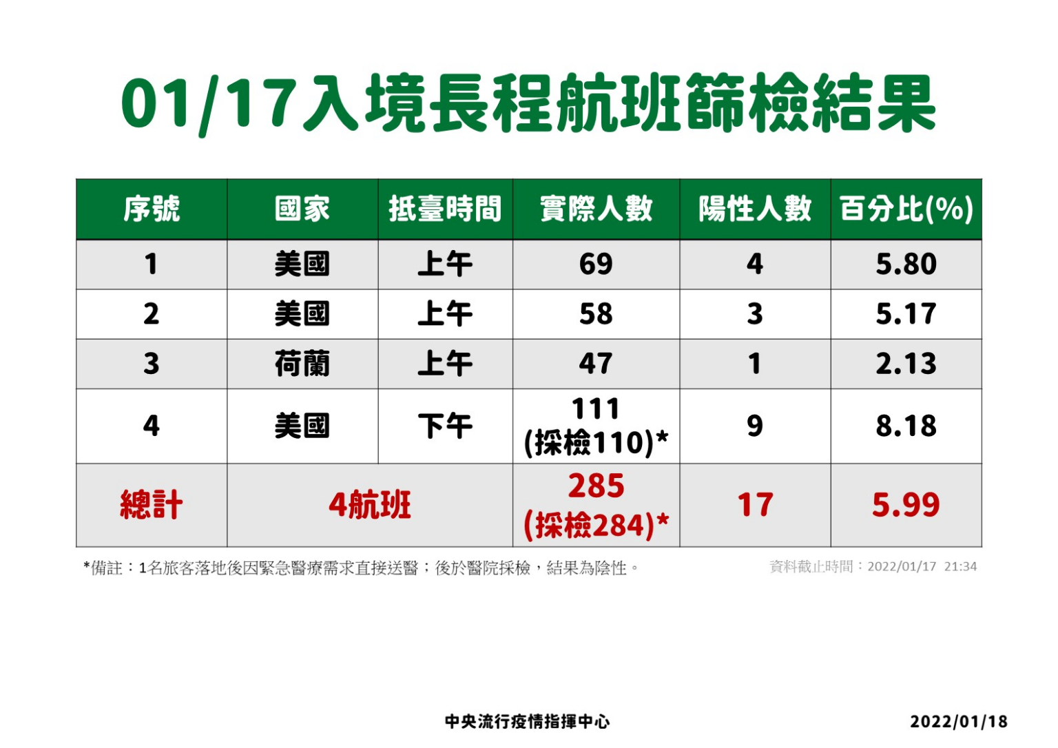 指揮中心說明,今日新增境外移入個案為33例男性、16例女性,年齡介於未滿10歲至60多歲,分別自美國(21例)、越南(5例)、加拿大(4例)、英國(3例)、法國(2例)、愛爾蘭、西班牙、瑞典、菲律賓、波蘭、墨西哥及巴拿馬(各1例)移入;另7例調查中。入境日介於今(2022)年1月3日至1月17日;詳如新聞稿附件。