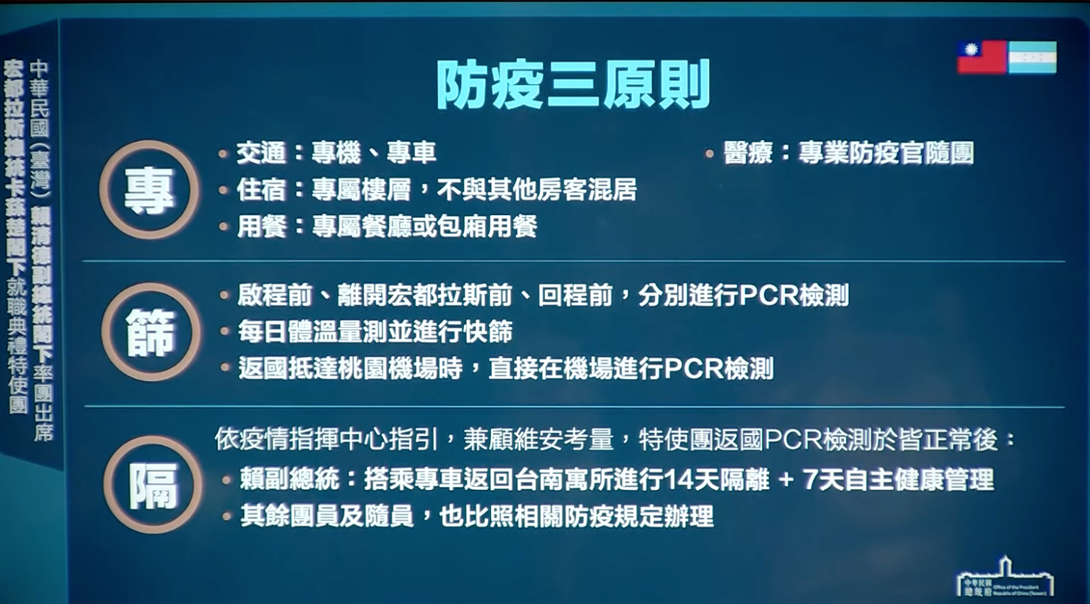 張惇涵提到,特使團除了配合當地防疫指引外,也遵守中央流行疫情指揮中心三原則,第一是搭乘專機、到當地搭乘專車,住宿安排有專屬樓層,用餐也會有專屬包廂,以及防疫官隨團;第二是篩檢,包括在啟程前、離開宏都拉斯前以及回到國內之前,會有3次PCR檢測,團員也會每日快篩、量體溫,回到桃園機場時也會在機場進行第4次PCR檢測。