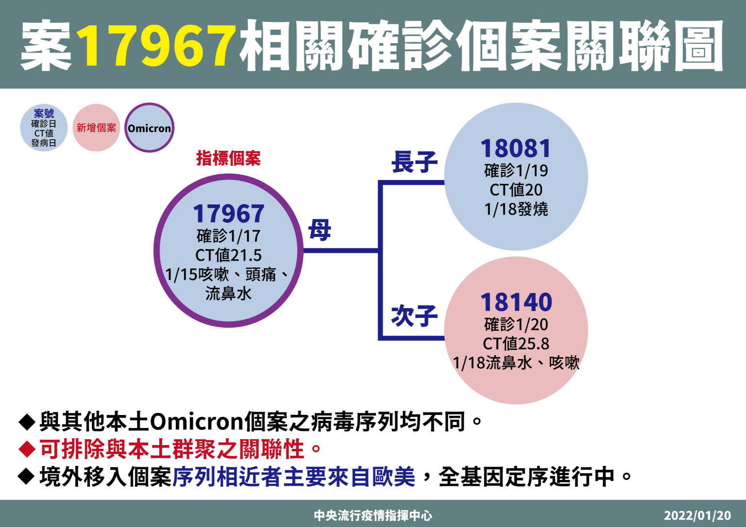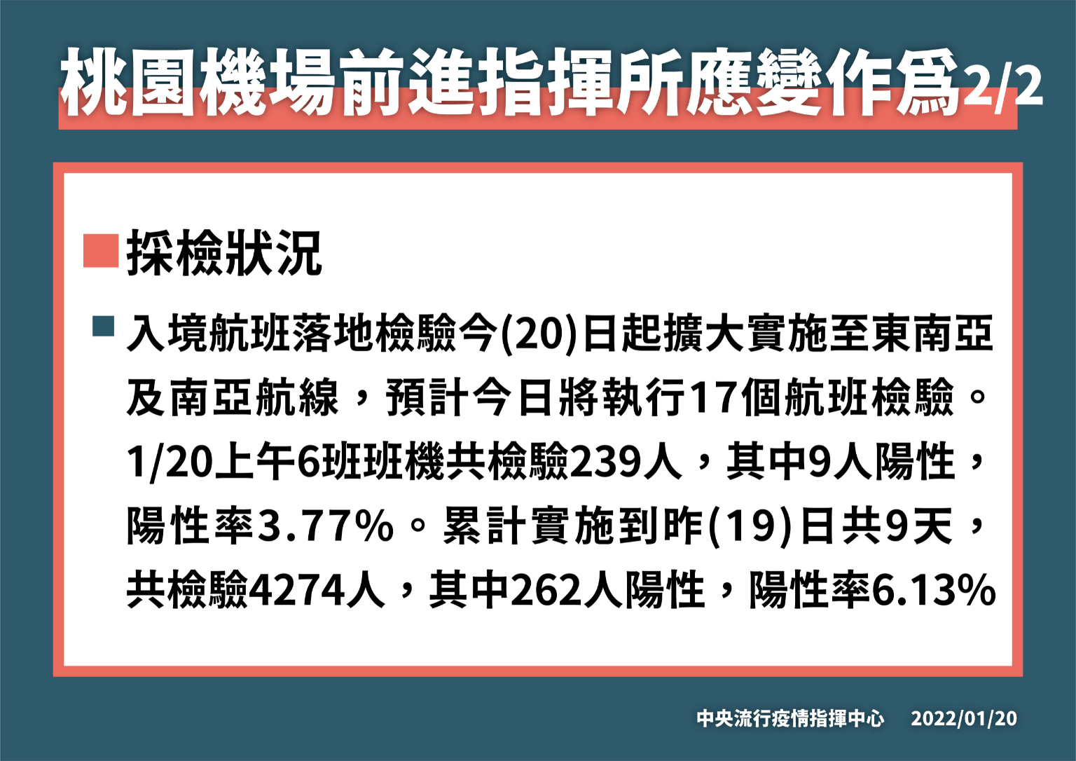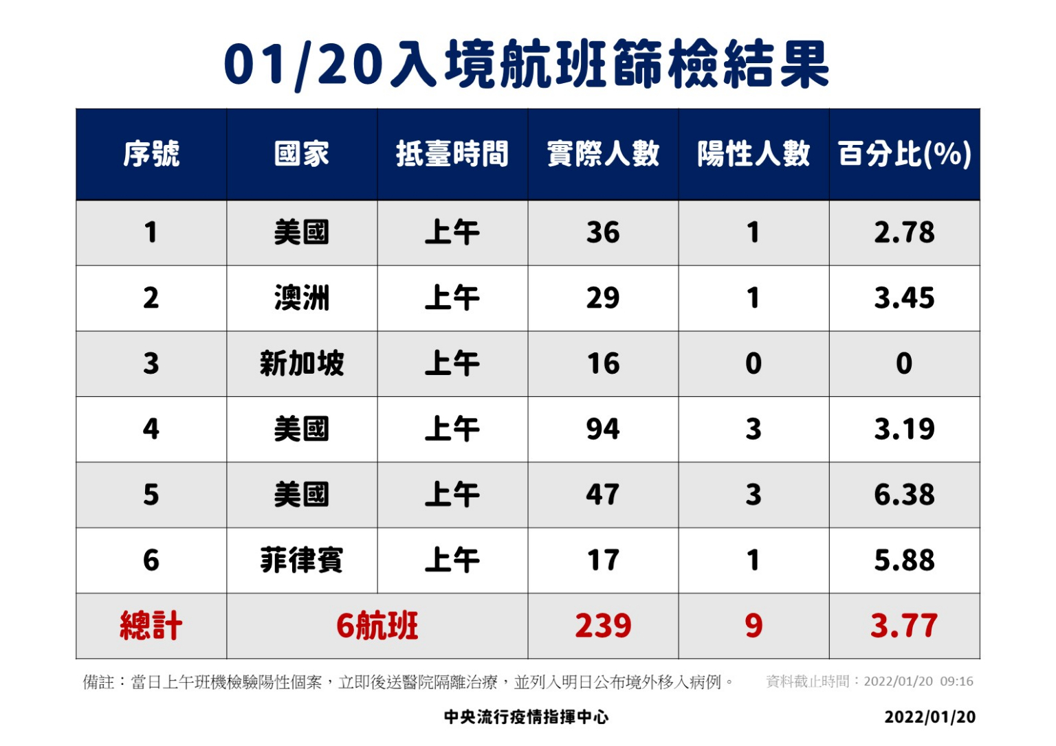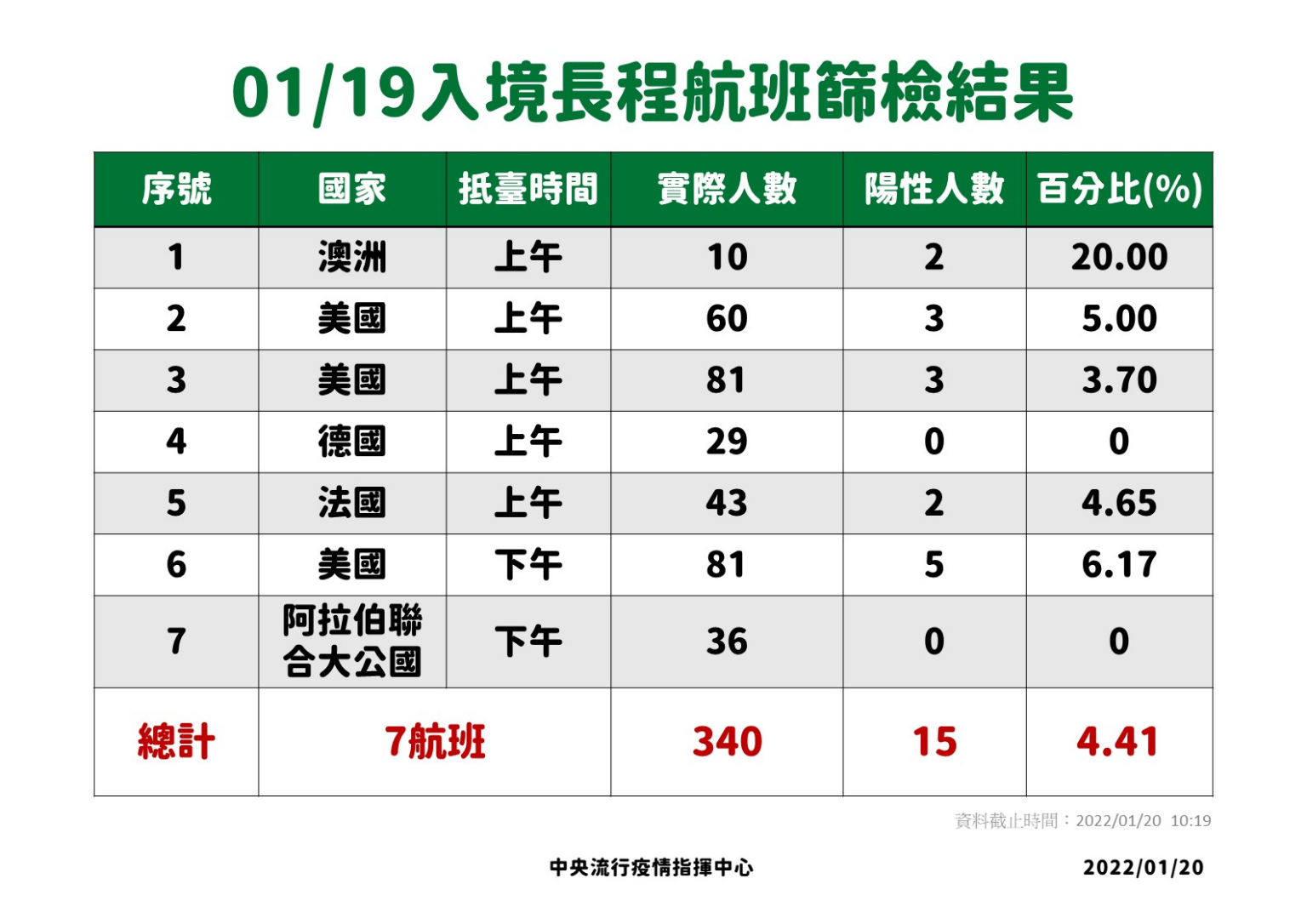 指揮中心說明,今日新增境外移入個案為13例男性、11例女性,年齡介於10多歲至50多歲,分別自美國(10例)、越南(3例)、法國及澳大利亞(各2例)、巴拉圭及沙烏地阿拉伯(各1例)移入;另5例調查中。入境日介於今(2022)年1月5日至1月19日