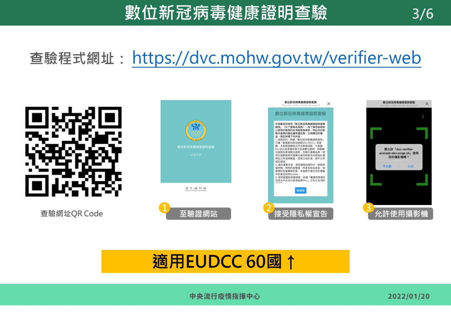 中央流行疫情指揮中心今(20)日表示,我國「數位新冠病毒健康證明」自去(110)年12月28日上線後已核發超過26萬份。考量國內外疫情升溫,各界建議及需求,指揮中心將於今(111)年1月21日上午8時開放「數位新冠病毒健康證明」供國內使用,共計三大功能:所有在國內接種者皆可下載、符合歐盟規範的查驗程式,可驗證60國的證明、提供具實名制的APP作為證明載具。