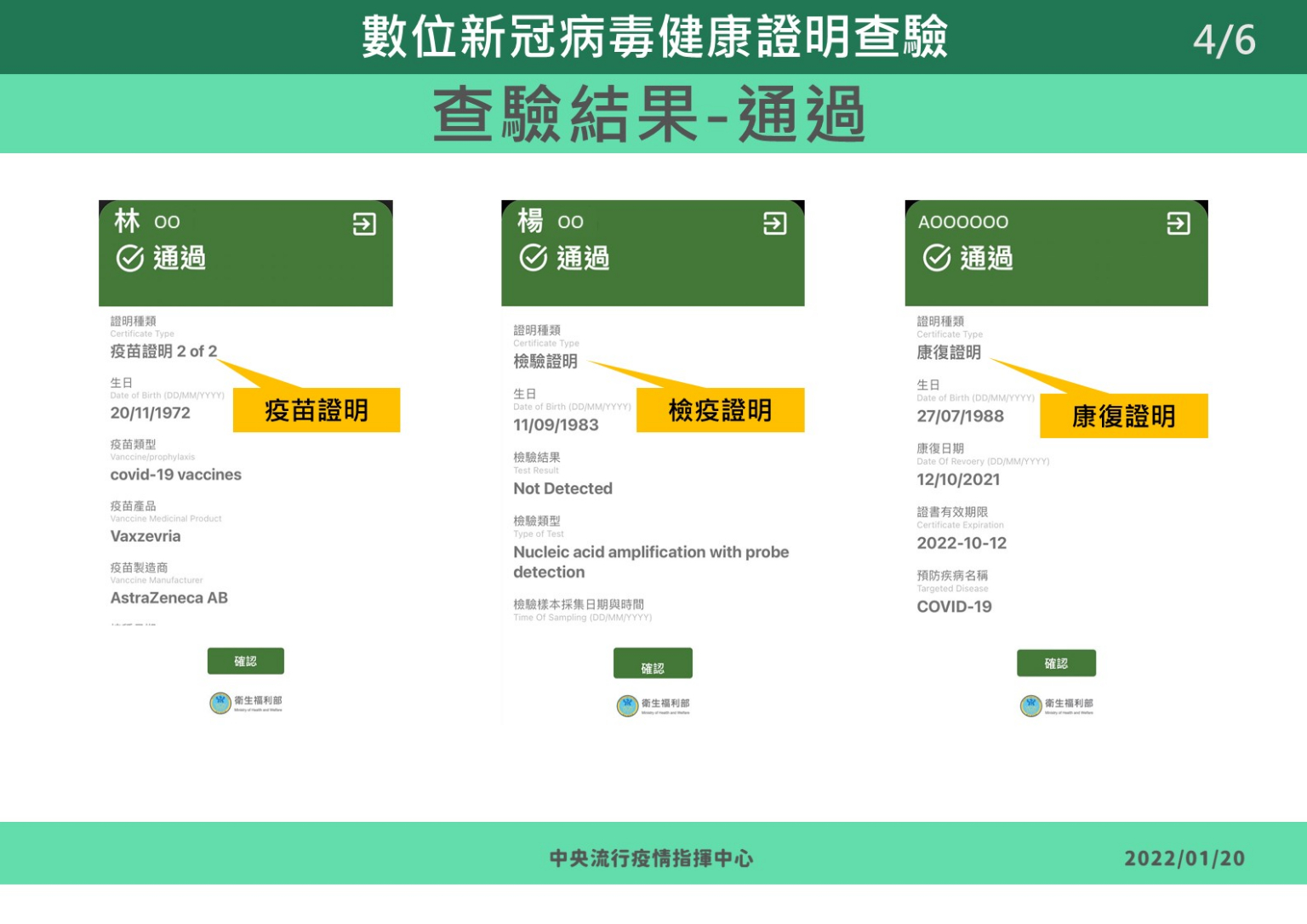 查驗程式以顏色、圖示及文字顯示查驗結果,綠色、打勾為通過,紅色、打叉為不通過,黃色、三角驚嘆號為待確認狀態(包括:接種不完整、效期不符、非我國同意的疫苗或檢驗等),不合規格的QR code則會出現解析錯誤的訊息。驗證程式個人基本資料僅會顯示姓名及出生年月日,如需嚴格確認是否為本人持有,建議仍需搭配其它身分證件。由於我國已是歐盟數位新冠證明(EU-DCC)的成員,故本查驗程式也可查證持同樣規格由其它國家發行的疫苗、核酸檢驗數位證明,及部分有發行康復證明的國家。