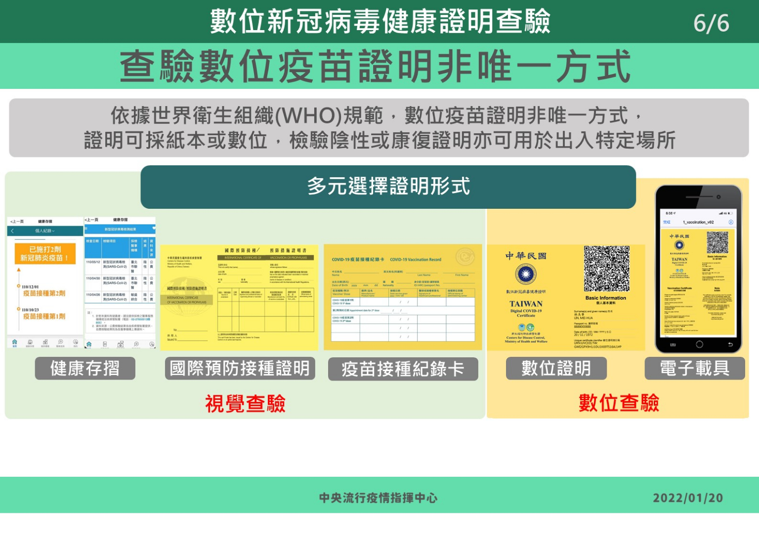 指揮中心提醒,依據世界衛生組織(WHO)規範,疫苗證明可採紙本或數位方式,檢驗陰性或康復證明亦可做為健康證明,數位證明僅是方式之一,民眾有多元方式可提供各場所查驗。