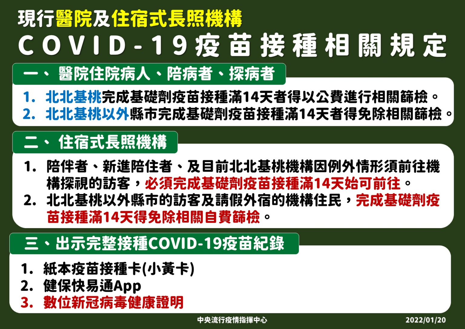 中央流行疫情指揮中心今(20)日表示,因應Omicron新型變異株之威脅,且國內本土疫情尚未平息,存在社區傳播風險,自今(2022)年1月21日起,民眾前往「歌廳、舞廳、夜總會、俱樂部、酒家、酒吧、酒店(廊)、理容院(觀光理髮、視聽理容)及特種咖啡茶室、夜店、舞場、三溫暖」等休閒娛樂場所時,應配合出示完整接種COVID-19疫苗紀錄,始得入內活動消費。接種紀錄除出示「紙本疫苗接種卡」外,亦可使用「健保快易通」或「數位新冠病毒健康證明」提供檢視。