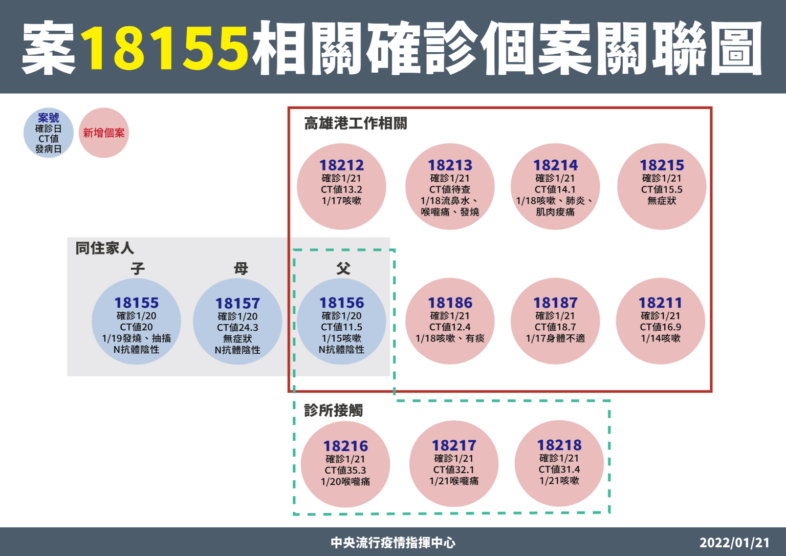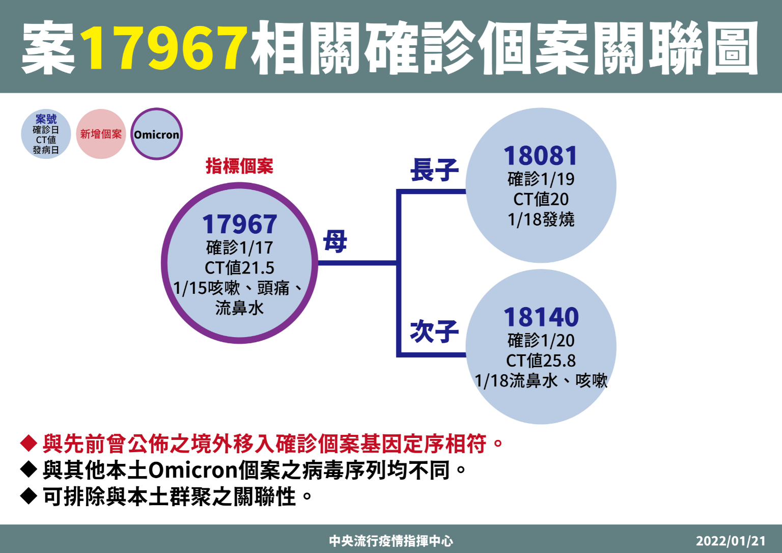 指揮中心說明,今日新增境外移入個案為20例男性、24例女性及1例調查中,年齡介於未滿5歲至70多歲,分別自美國(17例)、菲律賓(4例)、越南及以色列(各3例)、加拿大(2例)、波蘭、澳大利亞、韓國、新加坡、瑞典、俄羅斯、英國及愛爾蘭(各1例)移入;另8例調查中。入境日介於今(2022)年1月5日至1月20日;詳如新聞稿附件。