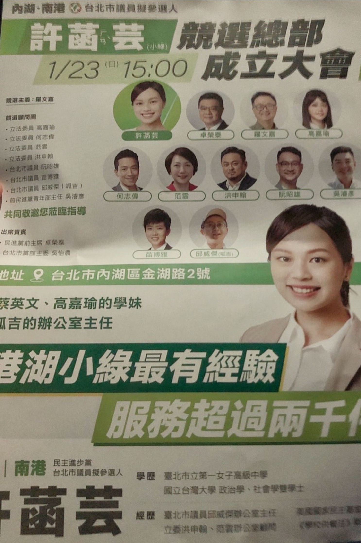 許菡芸競總開幕來賓,包括黨內孤鳥綠委高嘉瑜、何志偉、范雲、議員阮昭雄、台北市黨部主委吳怡農。其中不少人與前國策顧問黃承國有嫌隙,何志偉所屬的綠色友誼連線,之前為競選台北市黨部主委,綠色友誼連線派董娘薛凌,英系則支持王孝維,兩人搶主委搶到公開互槓,相互指控賄選,還被外界戲稱「董娘大戰尚萬強」,最後兩人都被勸退改由吳怡農接掌主委。