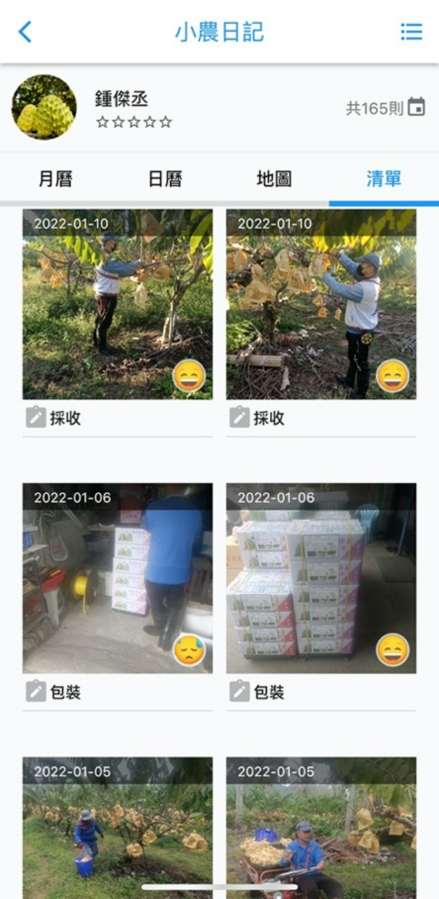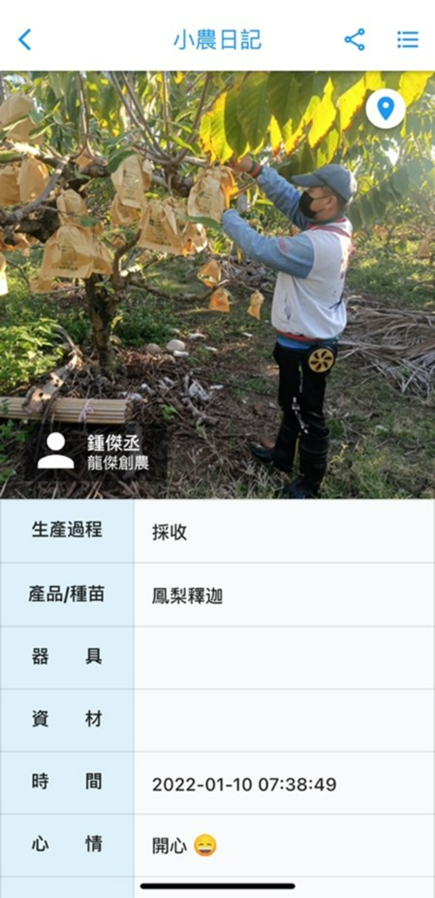 以台東都蘭釋迦小農鍾傑丞的釋迦生產為例,任何消費者都可以在努力小農App上看到他的工作紀錄。(圖片來源/方儉提供)