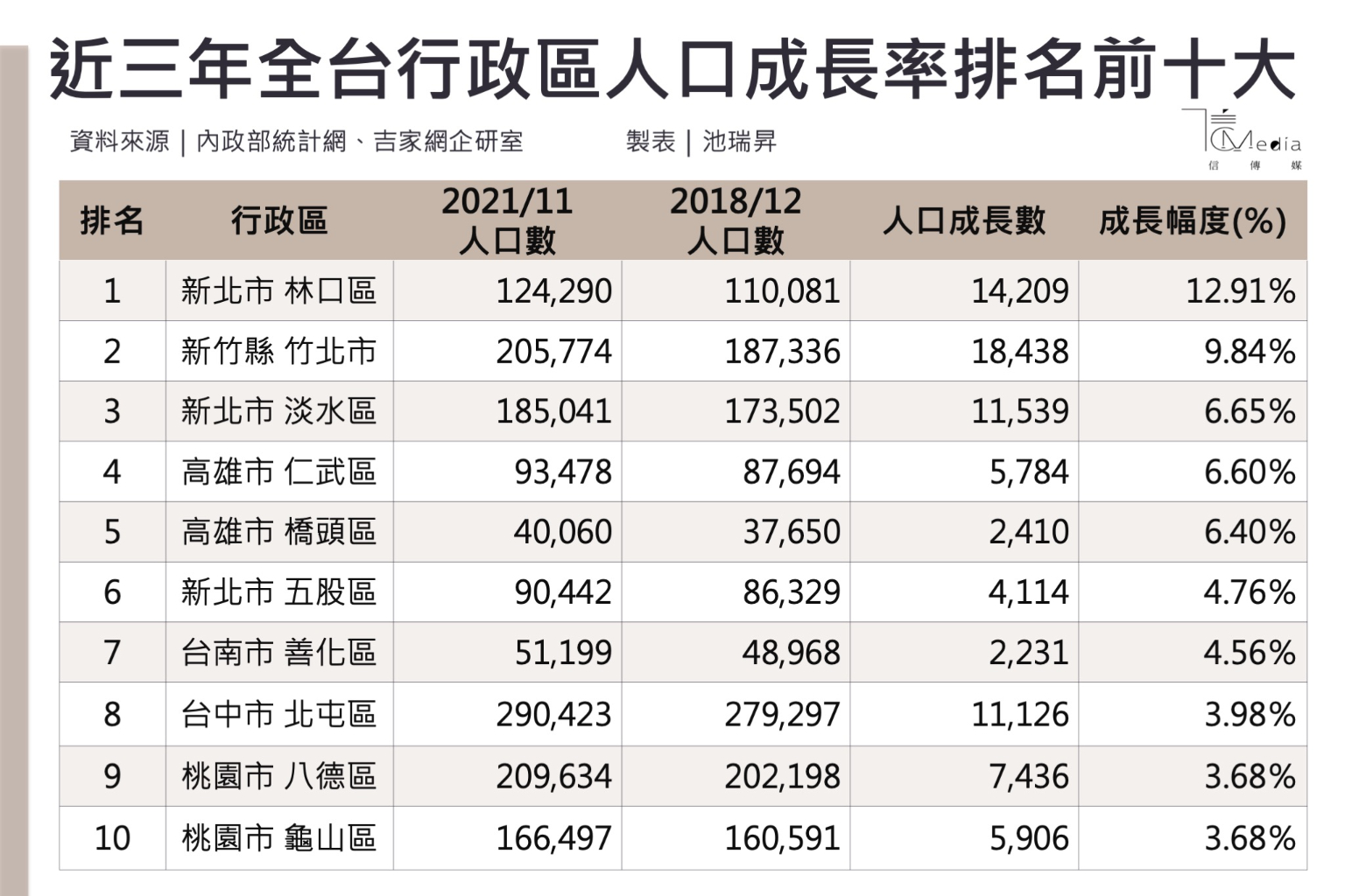 根據吉家網統計,近三年來全台行政區人口成長率排行前十名,分別是林口丶竹北丶淡水丶仁武丶橋頭丶五股丶善化丶北屯丶八德丶龜山等十大行政區,換句話說,中南部行政區佔據4個名額,北部則占有6席,其中,新北市林口區、新竹縣竹北市及新北市淡水區入列人口成長率的前三名。