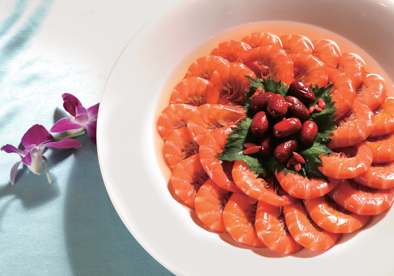 「鴻福饗宴」及「賀歲饗宴」分別在前段推出蝦料理,「宮廷花雕鮮蝦」曾榮獲2019年兩岸十大名菜名點,選用花蓮無毒白蝦,浸泡在紹興酒及中藥材的湯汁中24小時,蝦肉鮮甜脆嫩,酒香入味卻不嗆鼻。「蒜茸米粄蒸大蝦」將炸蒜末和蒜油特調的蒜蓉醬汁,拌入客家特產的米粄鋪在盤底,疊上淋醬的草蝦一起蒸煮,米粄入口即化,襯托鮮甜蝦肉。