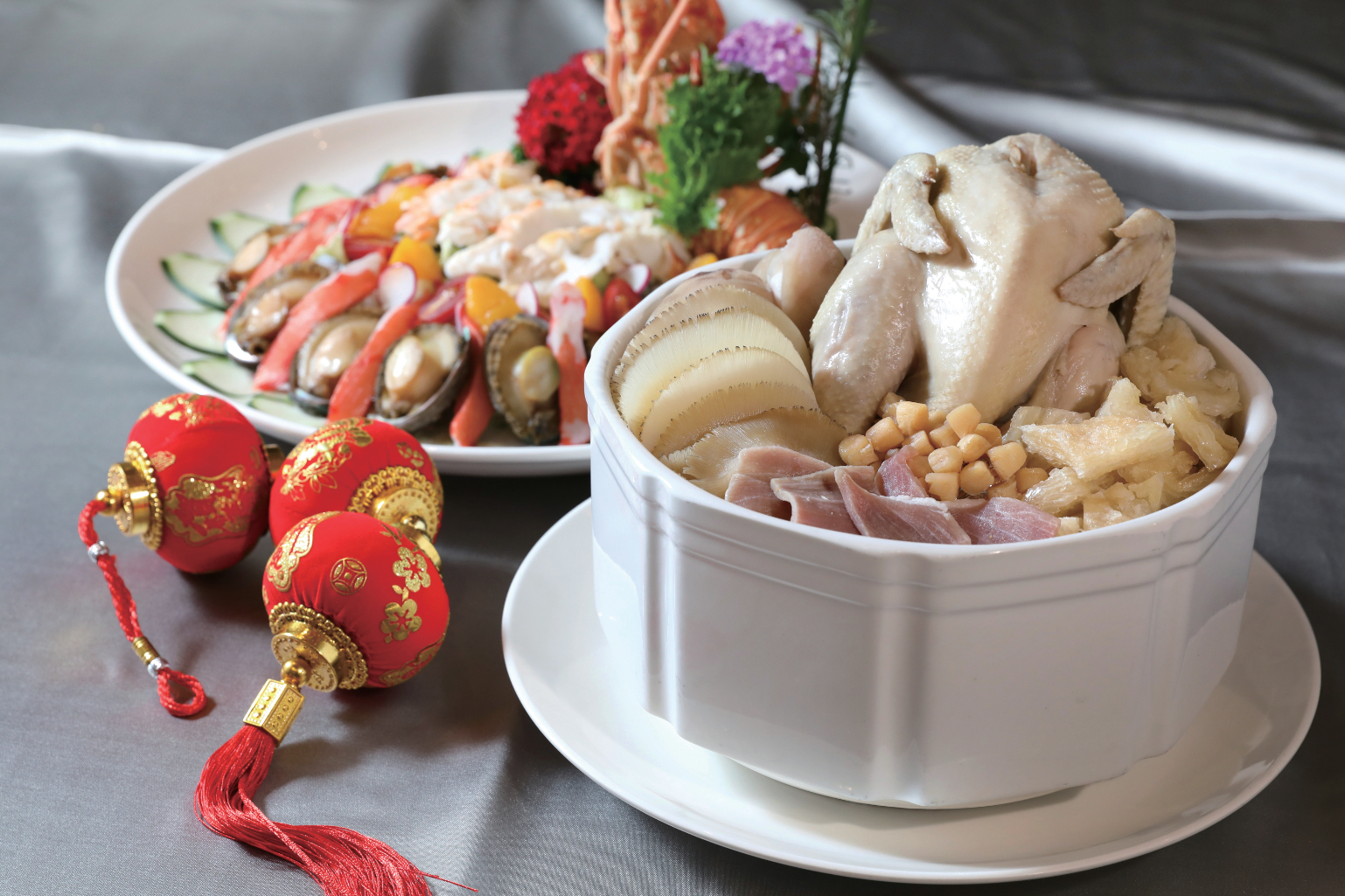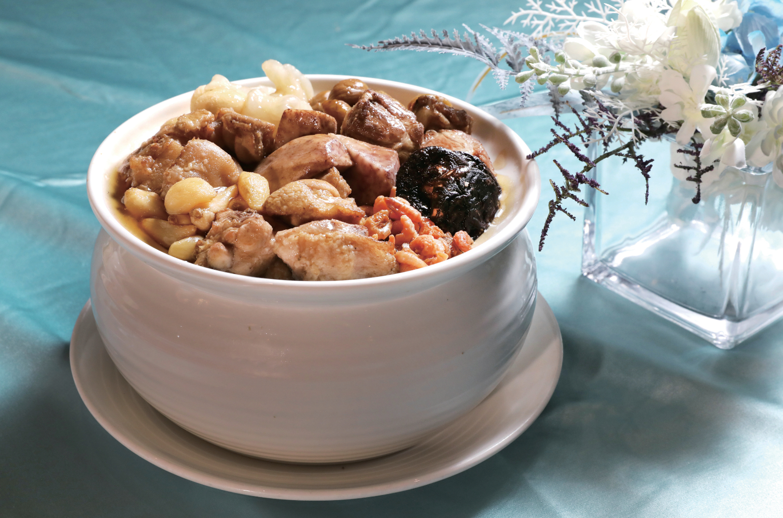 「花膠極品佛跳牆」用2天時間泡發花膠,而豬腳、雞肉、鵪鶉蛋、大甲芋頭及醃漬排骨等食材先過油鎖味,再分層入甕,加上雞骨清湯慢燉2小時,整體濃郁卻不膩。「魚翅雪蹄津白燉雞」源於江浙的白菜燉雞,把魚翅、家鄉肉、大白菜、豬腳、紅羽土雞和自製的雞豬骨高湯底,以鹽和米酒調味,慢熬出鮮甜清湯。