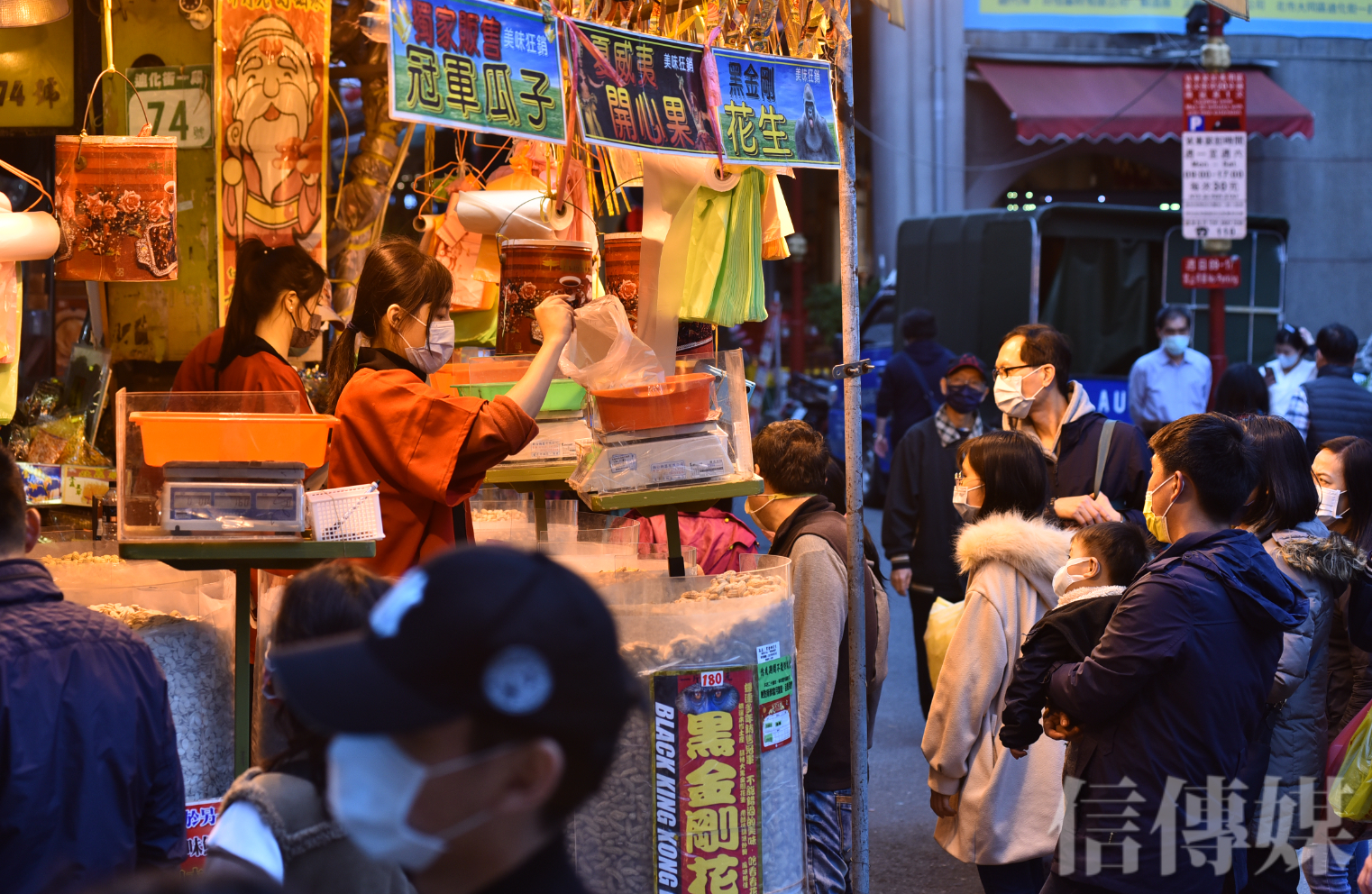 農曆春節將近,台北市迪化街湧入不少人潮來到年貨大街採買各項年貨,各小吃攤、特色商家排起長長的人龍,不過為了防範疫情擴散,台北市政府產發局商業處表示,目前仍維持現行規定例如禁止試吃等,會更提醒民眾注意防疫措施,之後將視疫情發展滾動式調整。