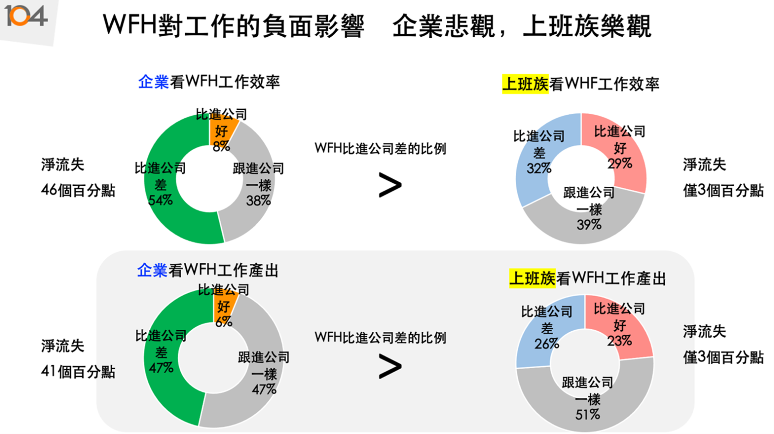 經歷過WFH,104人資長暨整合招募服務處資深副總鍾文雄分析,由於去年疫情突然爆發,許多企業在未做好充足準備即進入WFH。受訪企業中,WFH工作效率淨流失46個百分點;工作產出淨流失41個百分點。不過,上班族自覺WFH對工作影響程度較輕微,自評工作效率比進公司好的比例高出企業自評21個百分點;工作效率也高出17個百分點,工作效率、產出淨流失僅3%與進辦公室差異不大。