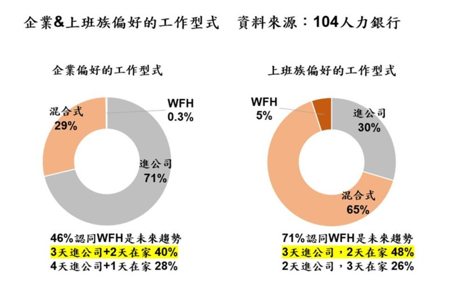企業喜歡進公司佔71%、混合式占29%、WFH只占0.3%,上班族最青睞混合式65%、進公司占30%、WFH占5%,企業與上班族對於混合式,以「3天進公司+2天WFH」最有共識。