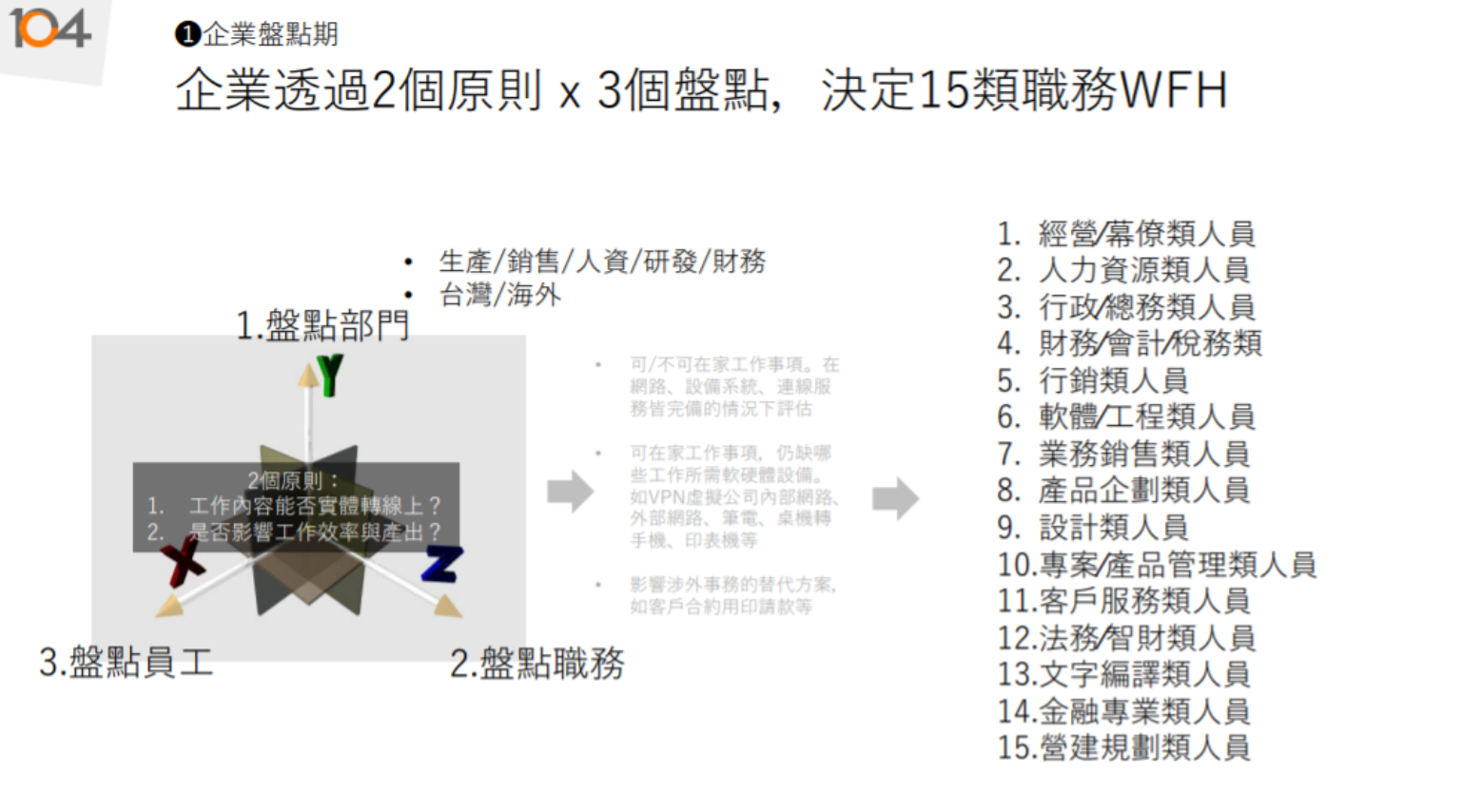 至於哪些職務企業偏向WFH?企業通常以「雙核心x3D盤點」的方式來決定實施範圍,總計有15項職務企業偏向WFH如下: