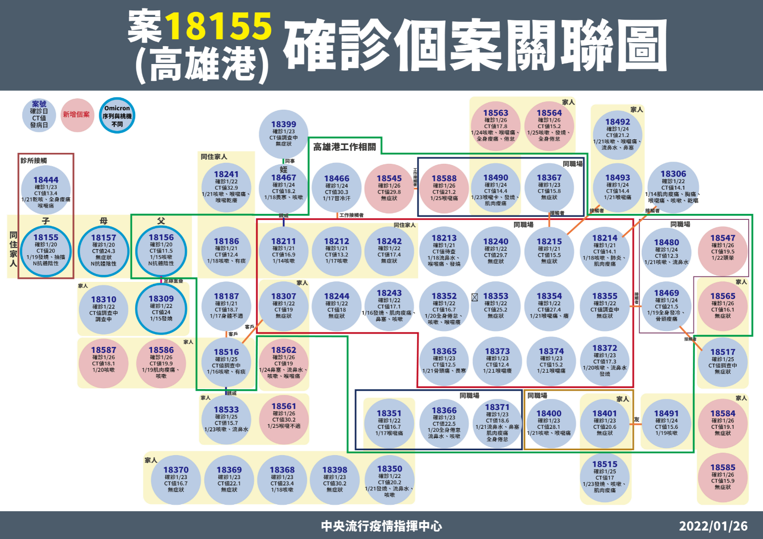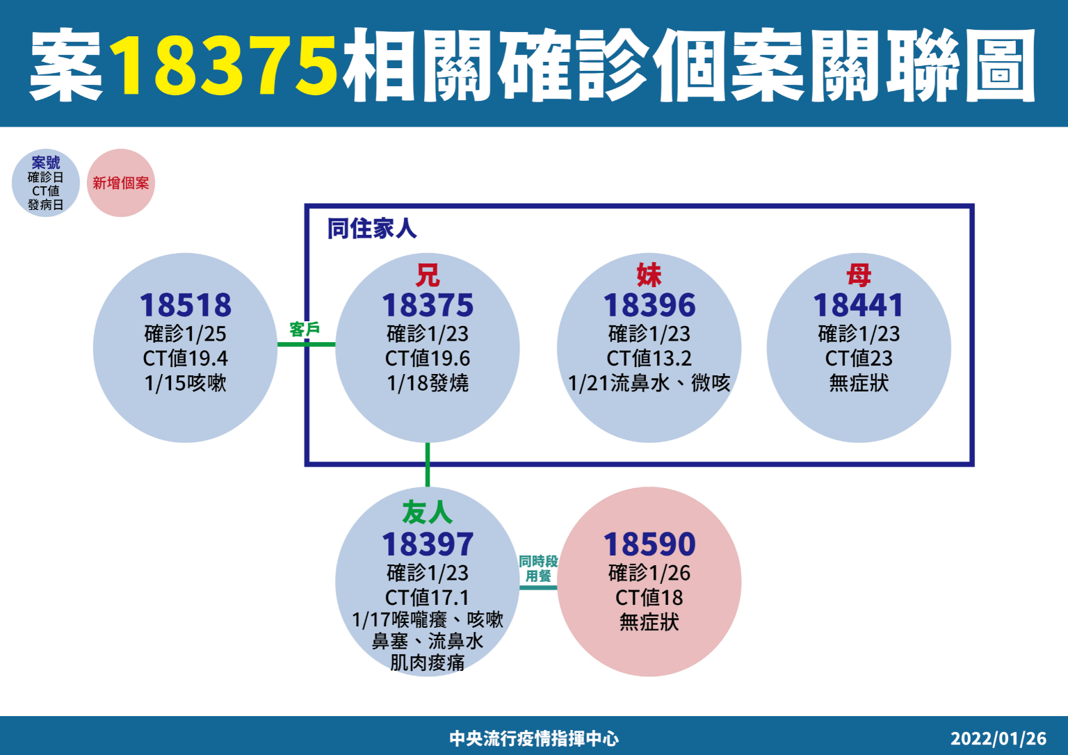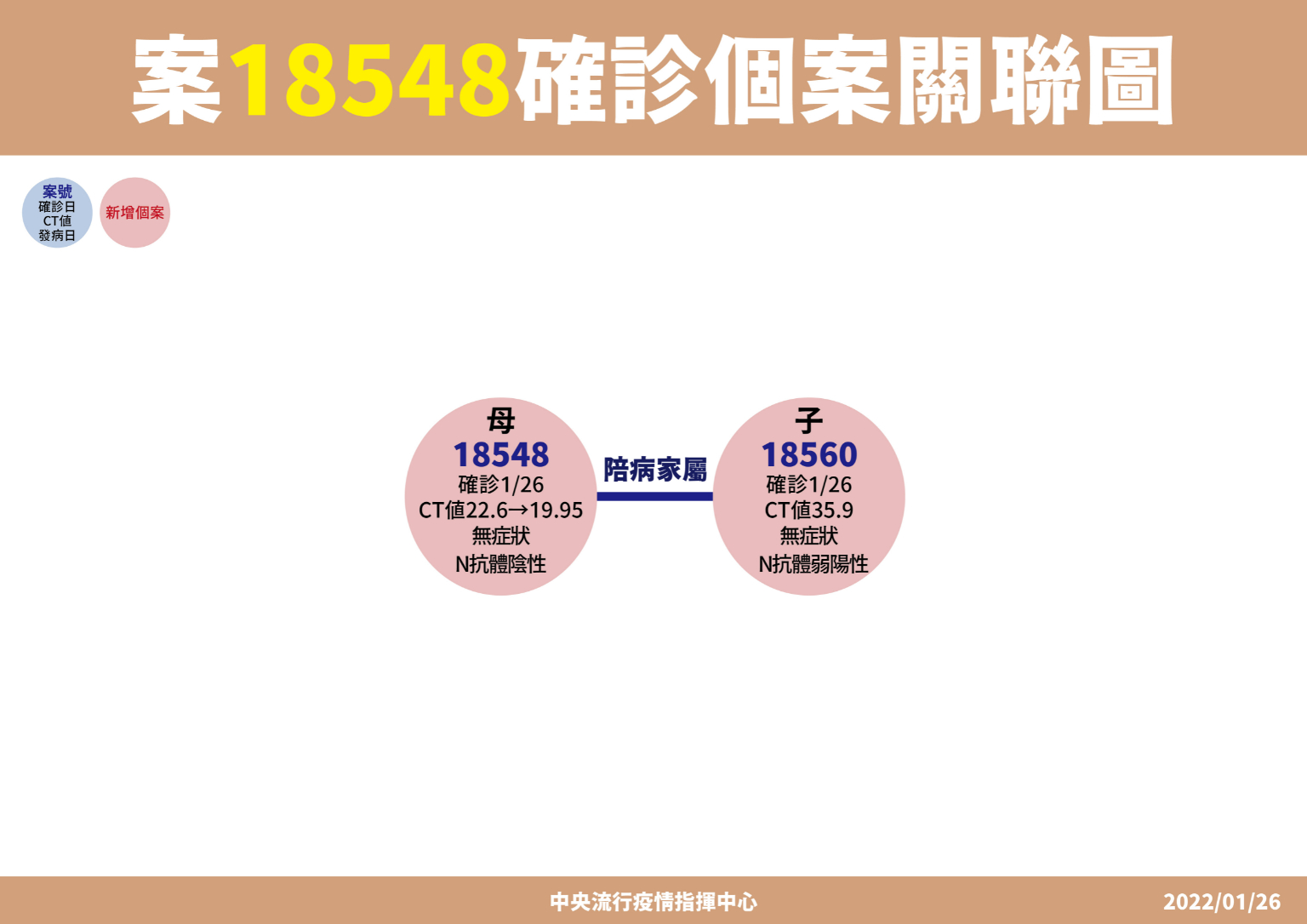 指揮中心說明,今日新增境外移入個案為27例男性、19例女性,年齡介於未滿5歲至60多歲,分別自美國(9例)、英國、加拿大及荷蘭(各2例)、馬來西亞、阿拉伯聯合大公國、法國、中國、瑞典、柬埔寨、越南、新加坡(各1例)移入;另23例調查中。入境日介於今(2022)年1月9日至1月25日;詳如新聞稿附件。