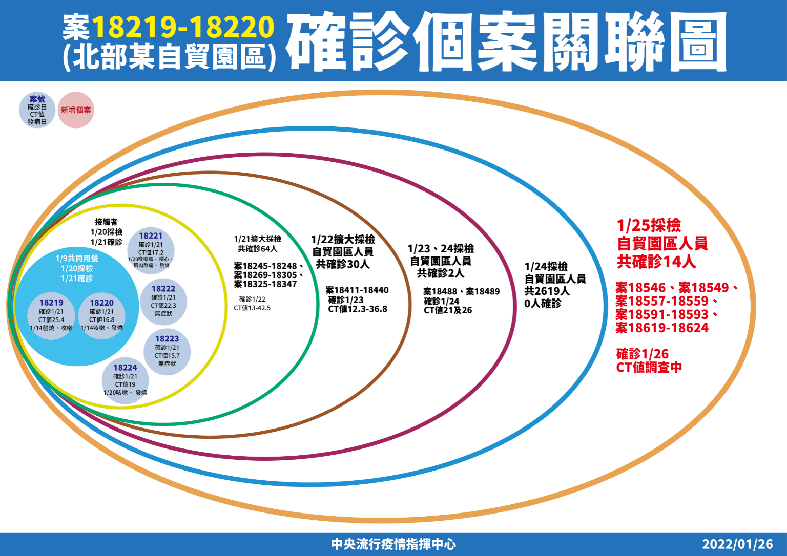 指揮中心指揮官陳時中指出,今日本土案例中桃園增29例,其中案18555為未知感染源個案,遠雄自貿園區已累計102位確診,加值園區原本有2家公司較嚴重已經停工,目前已採檢2,789人,有5位陽性,都是本國籍員工,皆為二採檢驗陽性,仍在居家隔離中。而亞旭電腦廠相關個案,今日總共新增14例個案,目前持續停工還要篩檢。