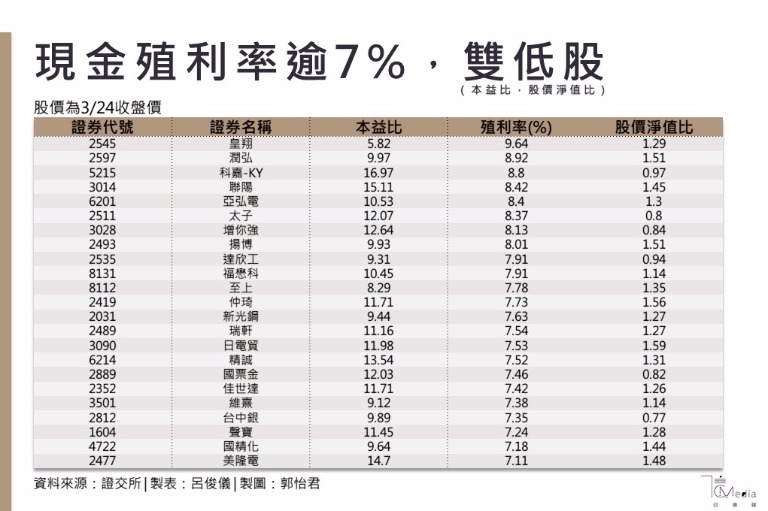 台股到2月底的平均本益比為17.13,股價淨值比1.69,從證交所公布的殖利率排行榜來看,搭配壽險業者高現金殖利率股選股條件,股價位階相對大盤低的個股電子股仍占大部分,但分散在個次產業中,包括佳世達、仲琦、燦坤、美隆電、百容、瑞軒、揚博、聯陽、昇貿、致新等等將近20家。鋼鐵族群則有新光鋼、允強等;另外,營建股、金融股通常也具有高殖利率特性,如台中銀、遠東銀、玉山金、國票金以及太子、達新工、皇翔、潤弘等公司都在證交所統計資料中。