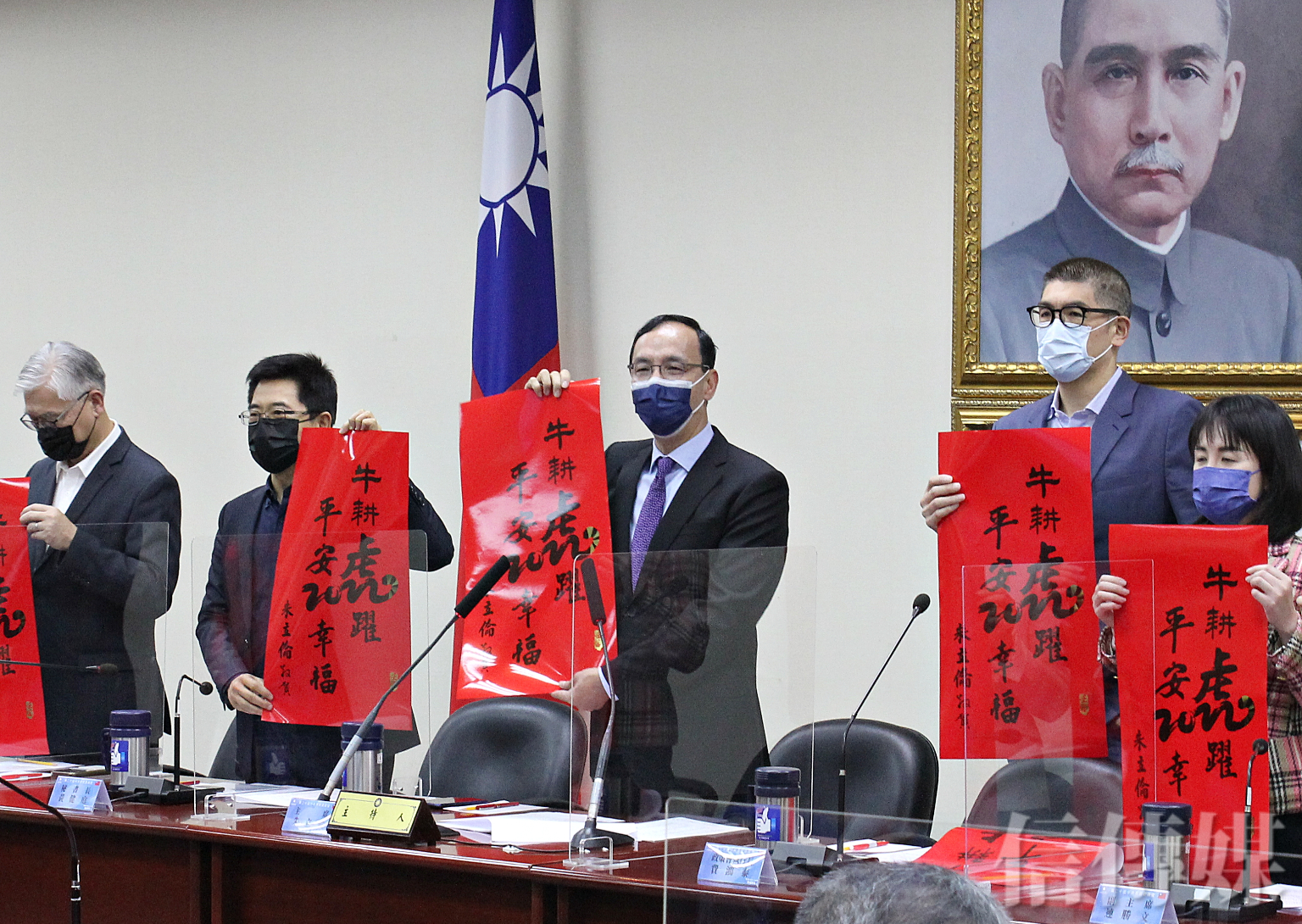 朱立倫說,今天是牛年最後一次的常會,大家即將告別牛年、邁向虎年,國民黨祝福大家能牛耕虎躍,牛年耕作、虎年能夠跳躍、成長,大家都能福虎生風,新年快樂。現場並發送有朱立倫伉儷署名的春聯,上書「牛耕虎躍、2022、平安幸福」。
