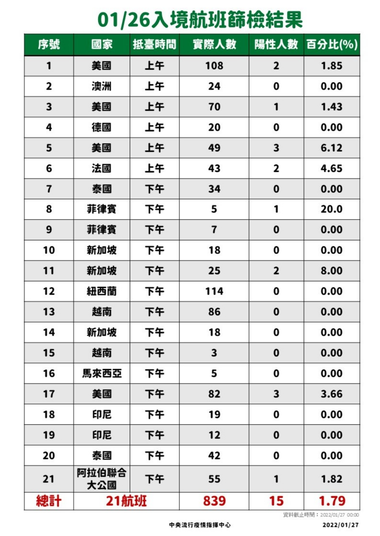 指揮中心說明,今日新增境外移入個案為21例男性、22例女性,年齡介於未滿5歲至60多歲,分別自美國(14例)、印度(3例)、越南、印尼、英國及法國(各2例)、衣索比亞、坦尚尼亞、新加坡、土耳其、菲律賓、南非、芬蘭、日本(各1例)移入;另10例調查中。入境日介於去(2021)年5月2日至今(2022)年1月26日。
