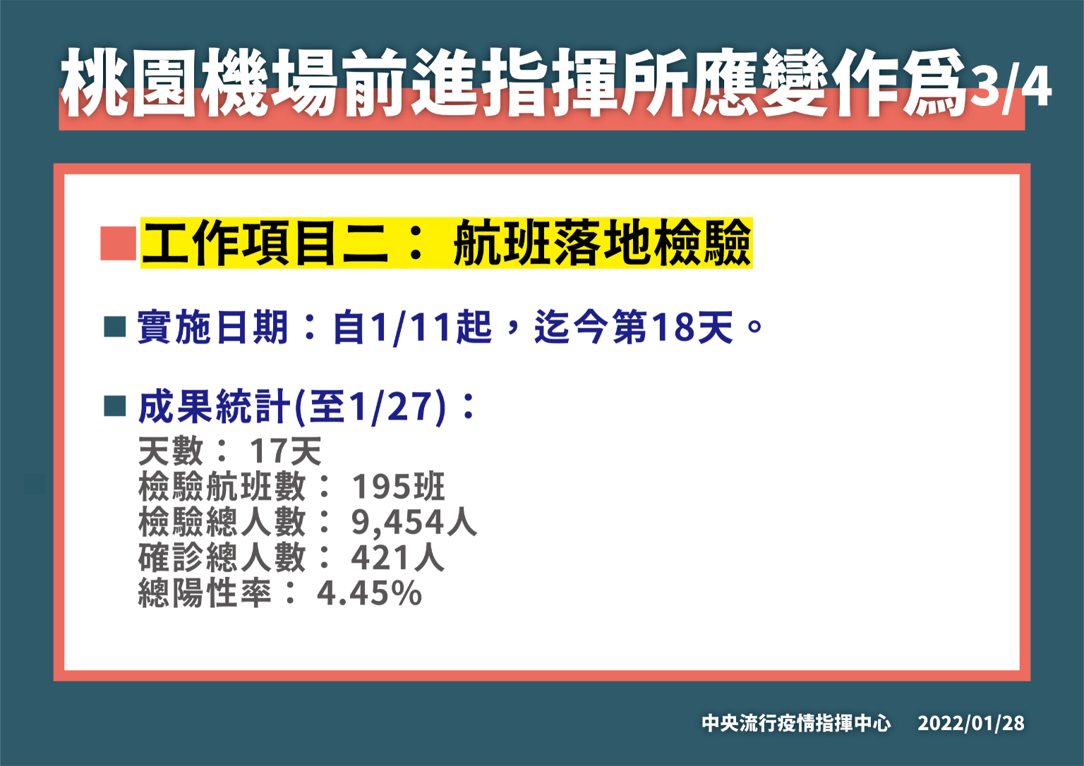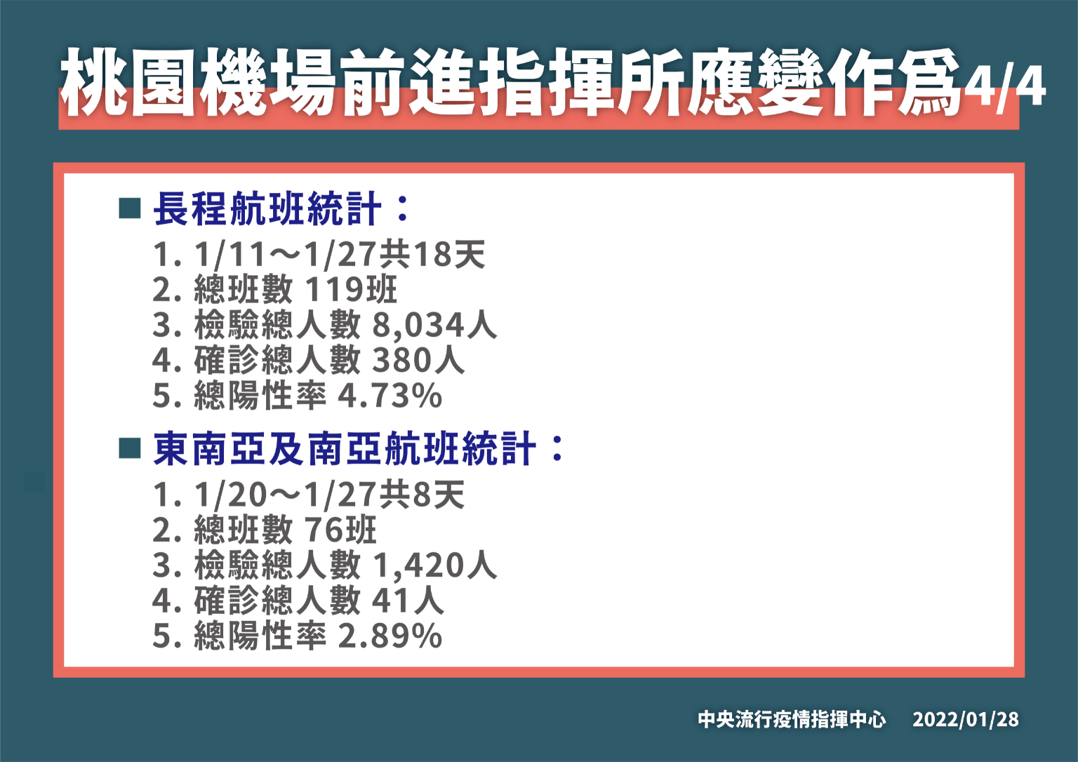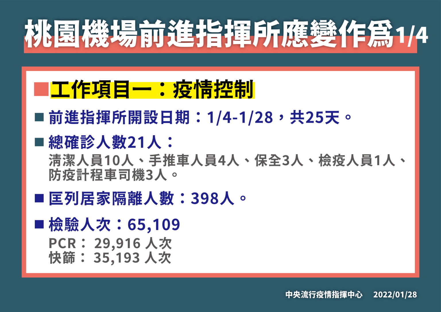中央流行疫情指揮中心今(28)日表示,為兼顧本島及離島防疫安全且保全醫療量能,中央流行疫情指揮中心宣布自今(2022)年1月29日(星期六)起搭機 /船赴澎湖、金門、馬祖旅客,出發當日有症狀者應暫緩行程並至醫院接受 PCR檢測;出發前 14天內有 疑似症狀者則需於機場 /港口進行快篩檢測陰性才允許登機 /船,籲請旅客提早至機場或港口報到。
