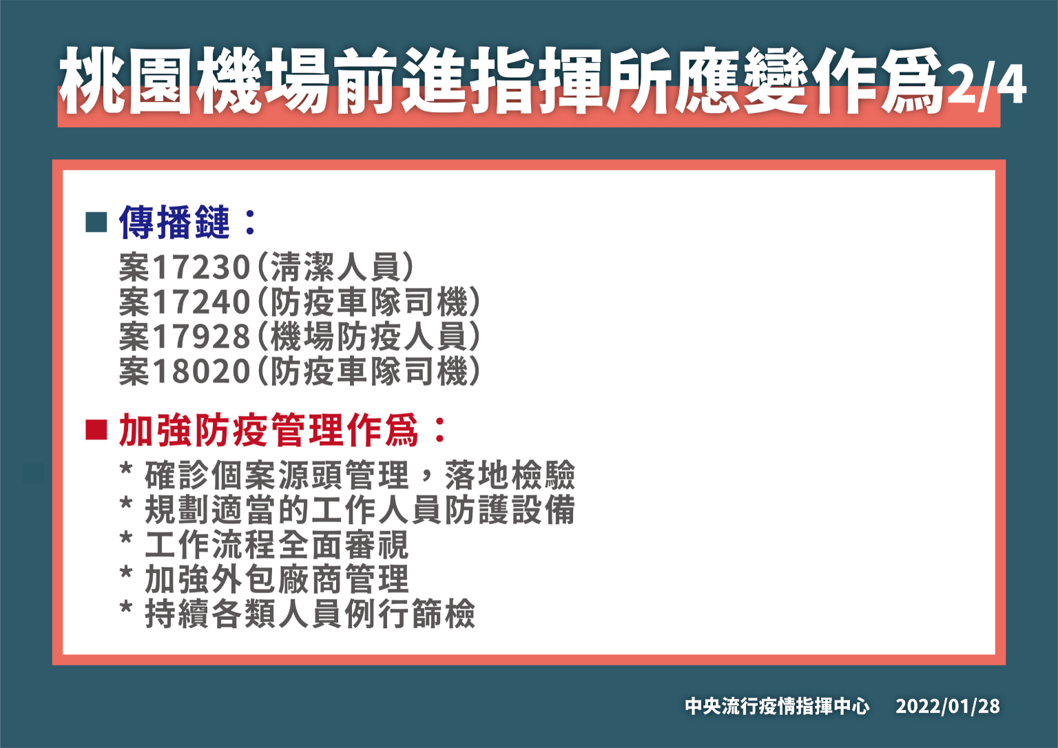 指揮中心再次呼籲,民眾應落實手部衛生、咳嗽禮節及佩戴口罩等個人防護措施,減少不必要移動、活動或集會,避免出入人多擁擠的場所,或高感染傳播風險場域,並主動積極配合各項防疫措施,共同嚴守社區防線。
