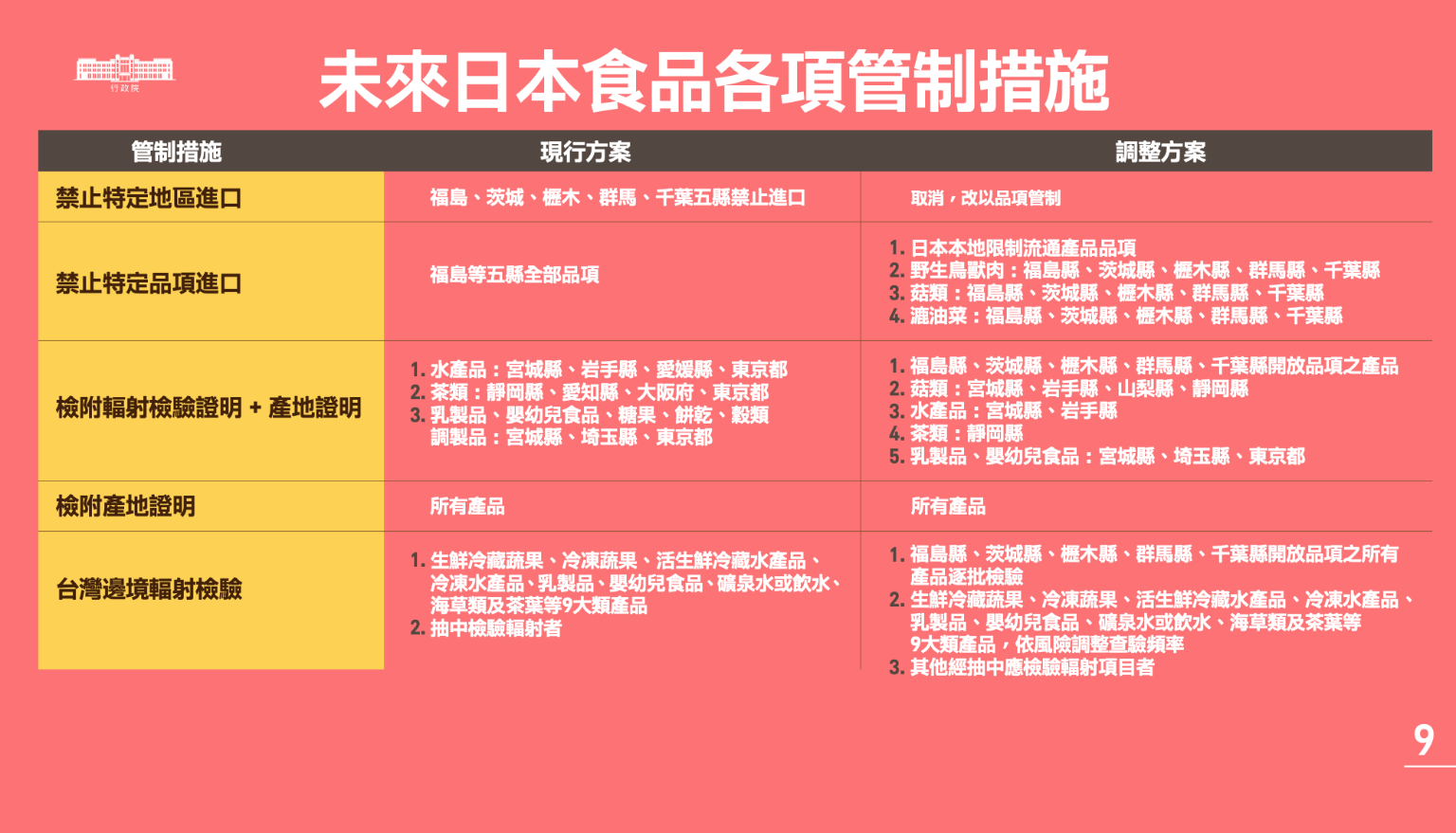 行政院宣布,將以「三原則」、「三配套」解禁日本福島5縣食品進口台灣,三原則包括回歸科學檢驗、比國際標準更嚴格、為國人食安把關;三配套則是從「禁止特定地區進口」改為「禁止特定產品進口」、針對具風險品項要求雙證證明(即輻射安全證明+產地證明)、福島5縣食品於邊境進行100%檢驗。