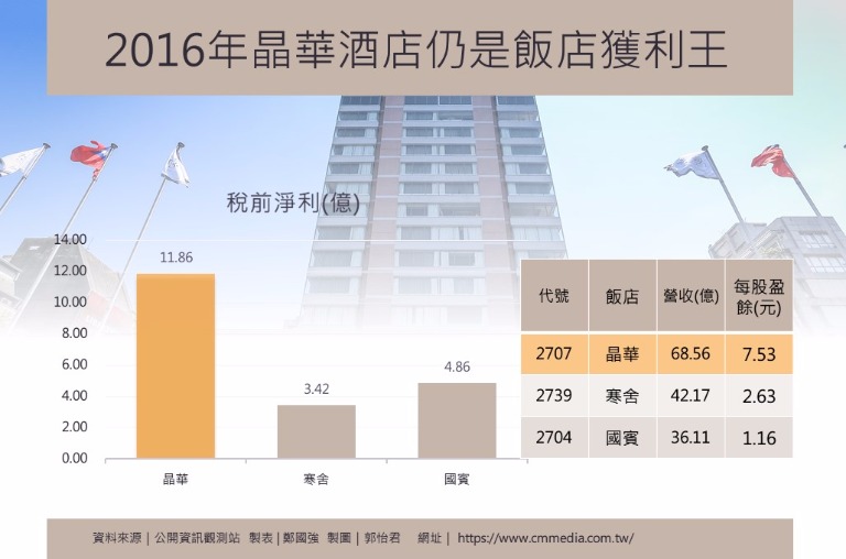 僅次於晶華酒店的屬於由賴英里掌舵的寒舍集團,旗下喜來登飯店、寒舍艾美、寒舍艾麗酒店全年貢獻3.42億稅前淨利,每股盈餘也有2.63元。國賓飯店也有4.86億元稅前淨利,但每股盈餘略少,只有1.16元。