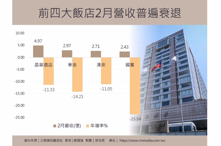 各大飯店2月營收部分,從晶華、寒舍、漢來、國賓、六福等前五大飯店2月營收通通較去年同期衰退1成以上,國賓還重挫23%。一名飯店副總表示,和陸客沒有甚麼關係,是因為去年農曆過年在2月,今年在1月,所以營收自然表現較差。