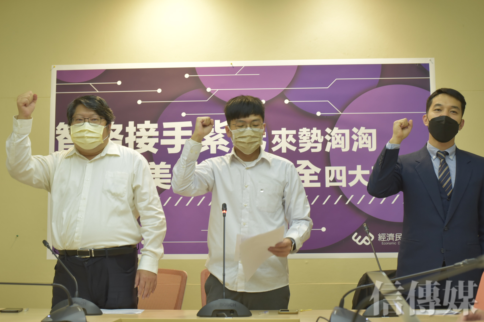 「黃天牧加油、王美花加油、張銘斌加油、顧立雄加油、傅棟成加油。」經濟民主連合、台灣公民陣線組織10日公開呼籲金管會、經濟部投審會、國安會對於「大陸地區從事投資或技術合作許可辦法」、「大陸地區人民來台投資許可辦法」等修法,以免中國資金趁法條之漏洞混入台美之間的關鍵技術如半導體等供應鏈,對我國國家安全與外交關係造成危害。