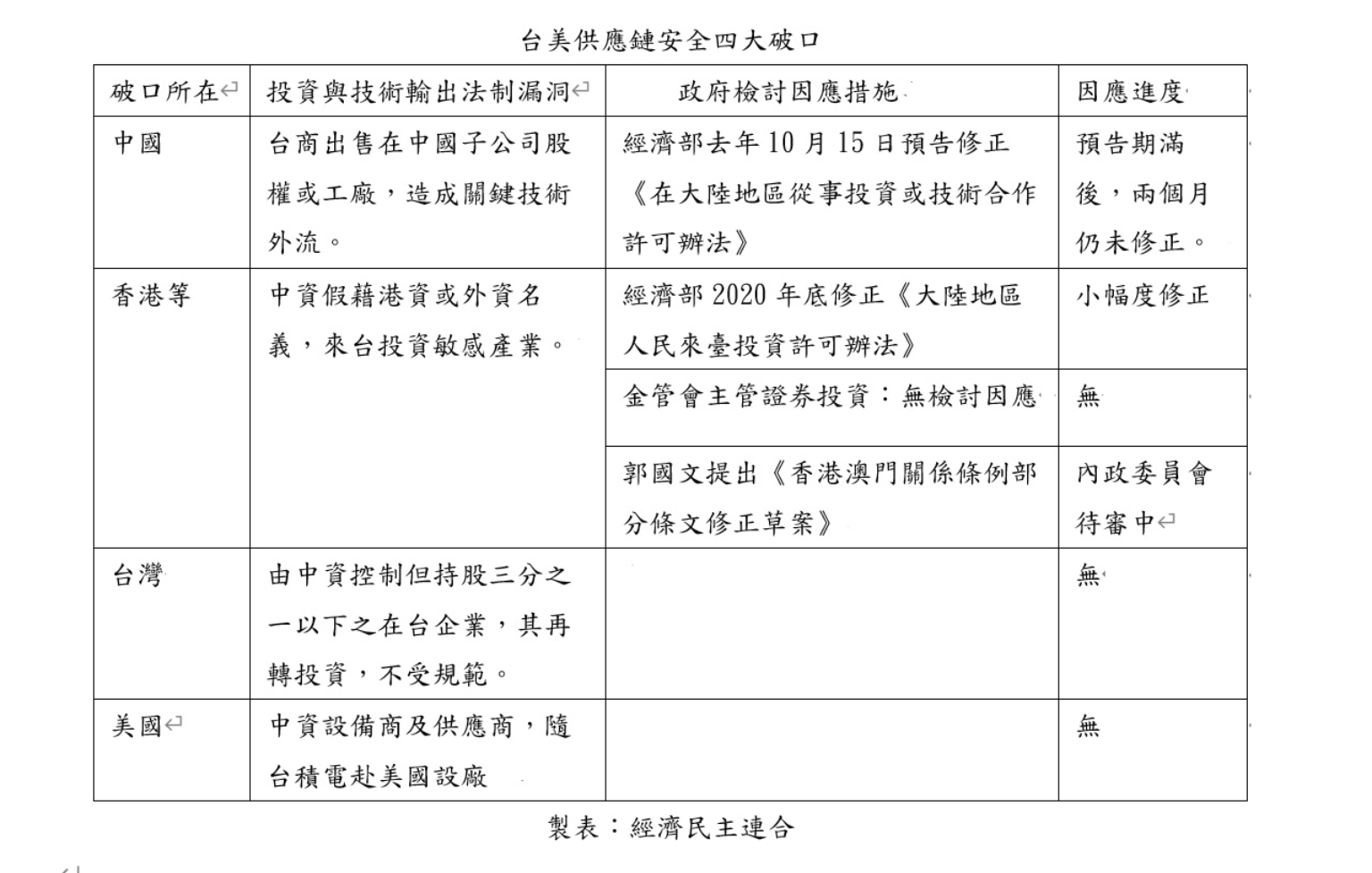 賴中強指出,台灣的投資與技術輸出法制確實存在重大漏洞,而成為台美供應鏈安全的四大破口,分別是台商在中國的出售漏洞、假港資真中資侵台併購、繞開投審會吃下台灣科技廠、中資趁台積電赴美設廠而打入供應鏈。