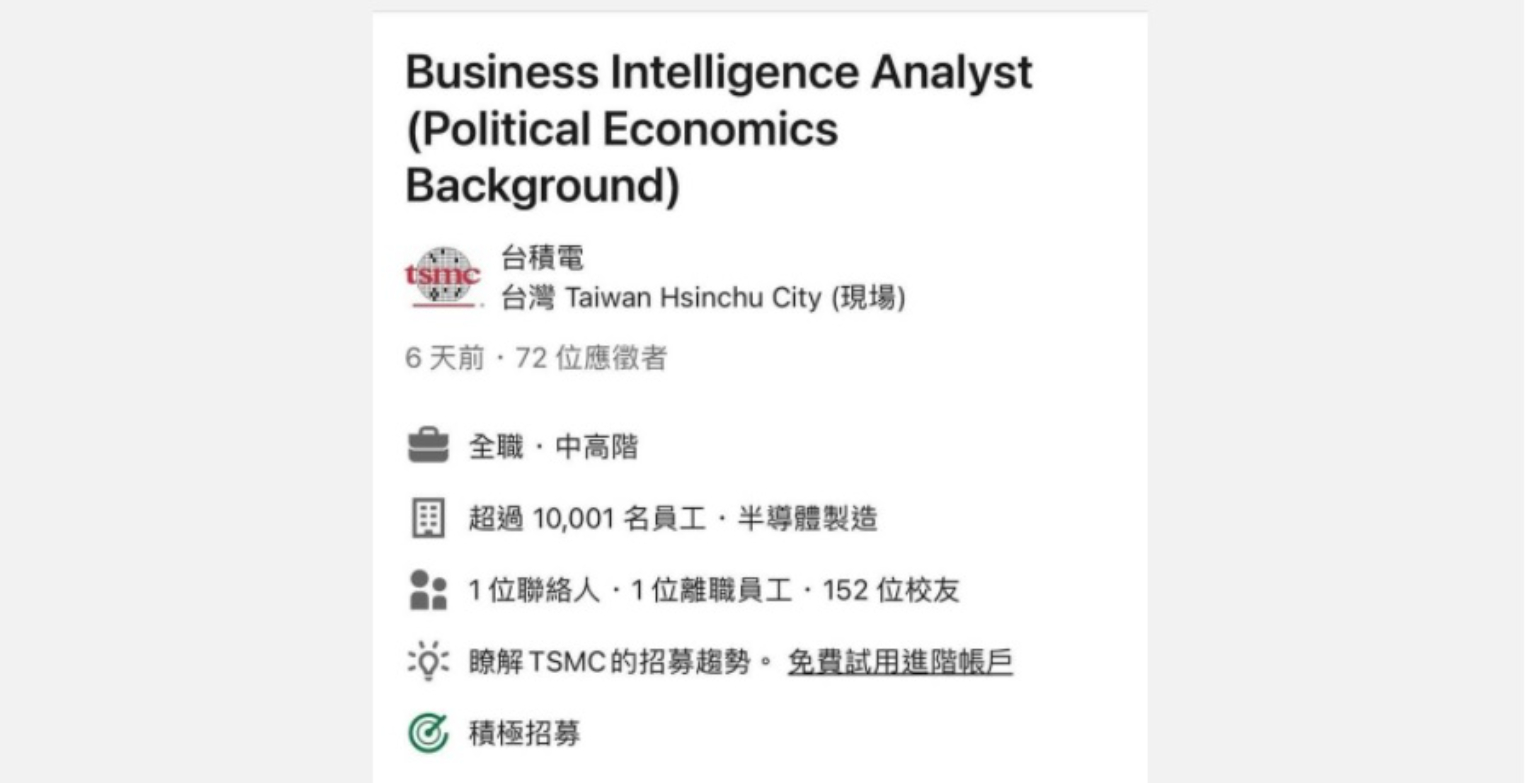 台積電首次對外徵招政治學博士,超過70個應徵者