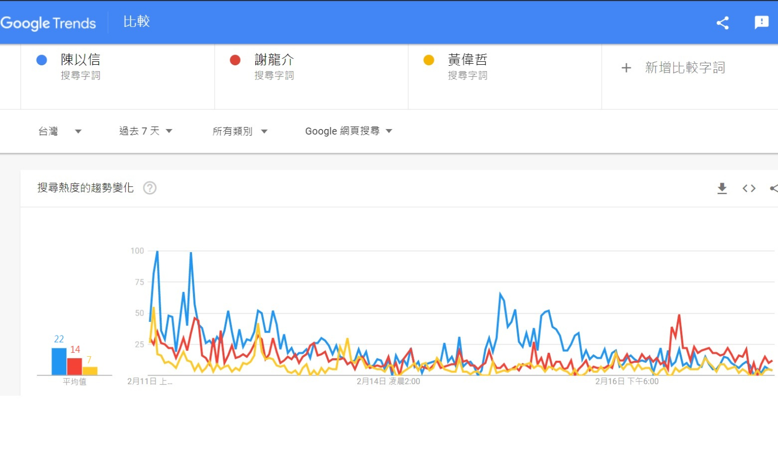 果不其然,在猛攻市政與「暗獨」的助攻下,根據《Google Trends》網路搜尋熱度統計,陳以信的熱度平均值達到22;意思是說,這段期間最熱門的議題如果是100%,陳以信的熱度平均值便有22%。至於他的黨內對手謝龍介則為14%,被陳以信猛攻的現任市長黃偉哲則僅有7%。