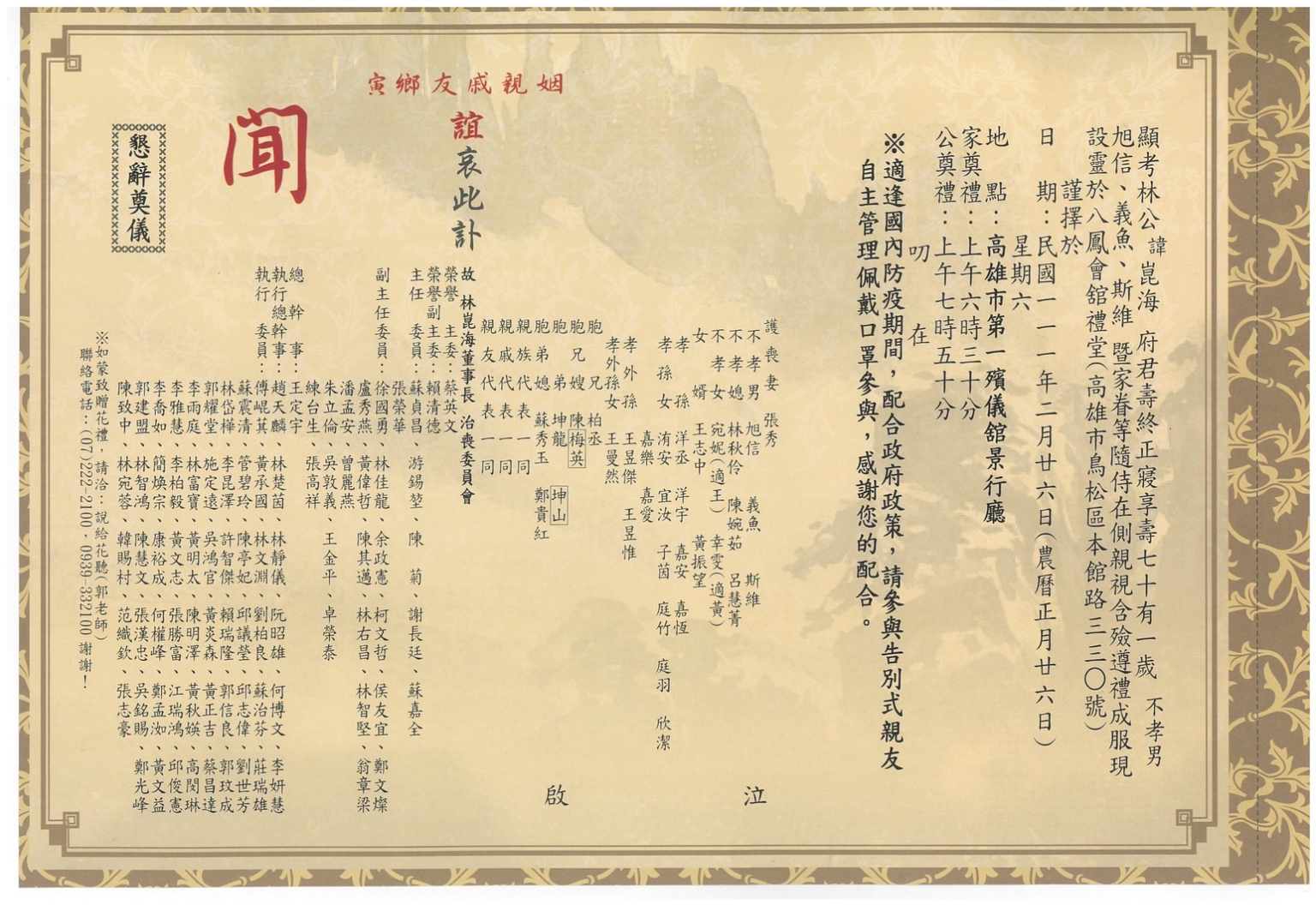 治喪委員會的成員名單也展現林崑海超強人脈,第一版已經是政界要角雲集,過了5小時後又浮出第二版訃聞名單,多了許多藍綠政要外,媒體高層也赫然入列,整張訃聞帖子名單幾乎滿版,也讓林崑海傳奇又多添一筆。