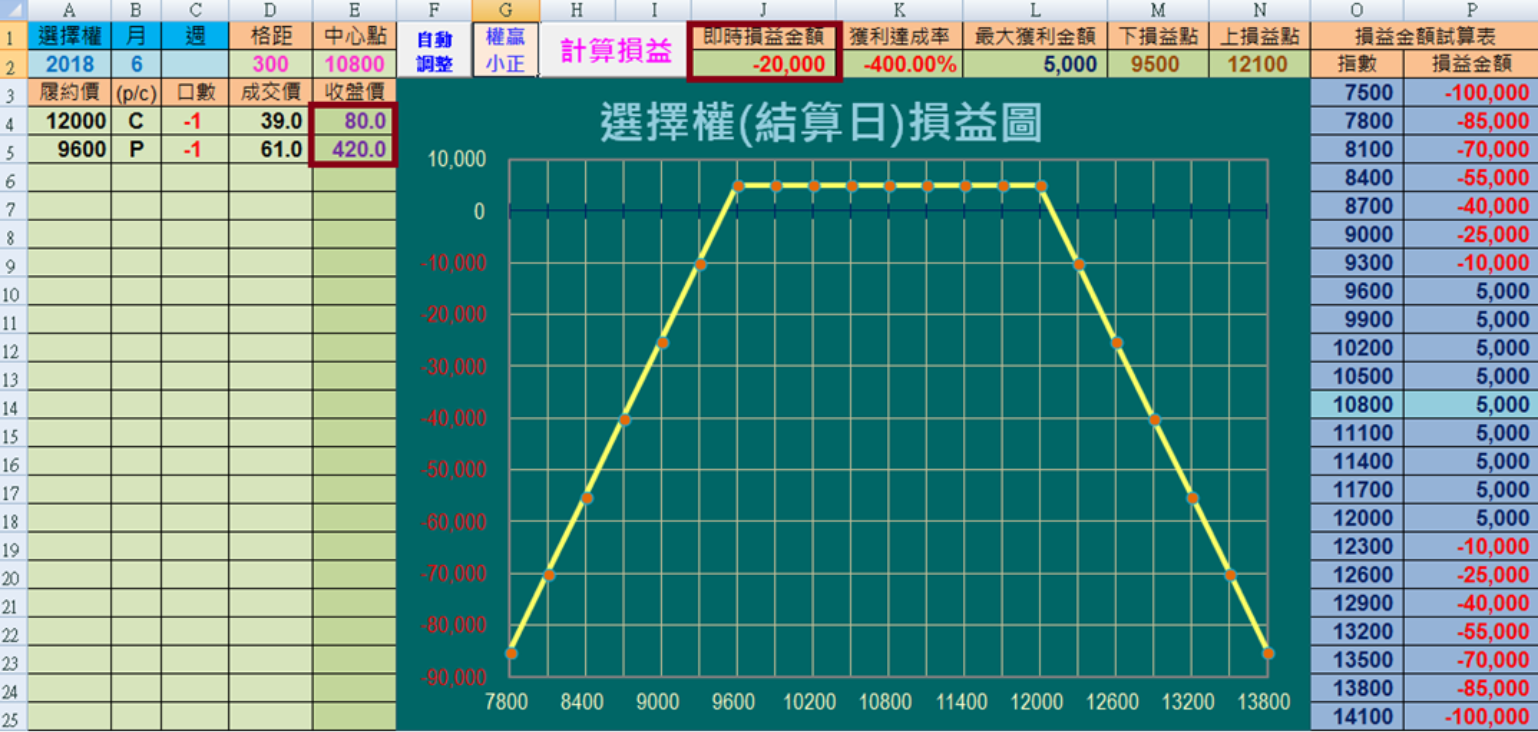 「建這樣子倉位的人一定是這樣子想,只要到6月20日結算前不要跌破9500點且不要漲過12100點都可以輕鬆賺到5000元。」