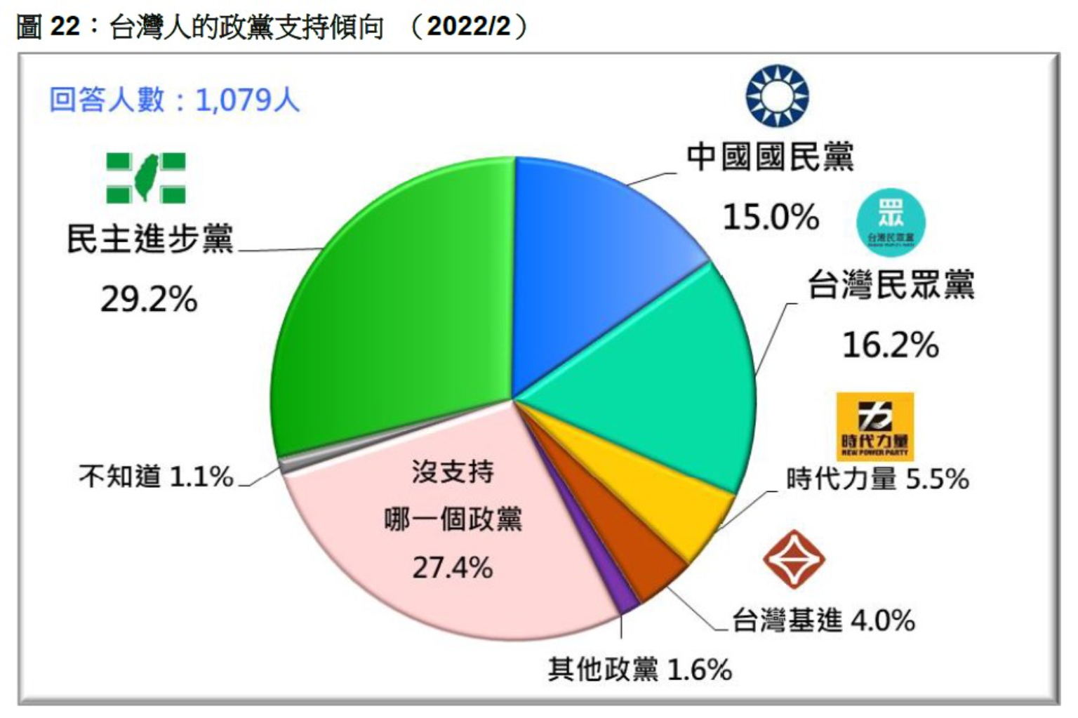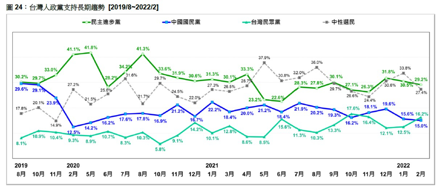 台灣民意基金會2月民調顯示,民進黨支持度仍延續2019年以來的居冠地位,雖較上月略降1.3個百分點,但仍保有29.2%近三成的高支持率,下滑原因恐是總統蔡英文1月底赴經國文化園區開幕儀式和開放福島食品所致。