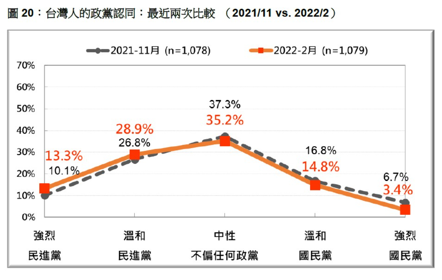 藍綠基本盤亦有消長,比較前次2021年11月調查,泛綠支持者上揚5.3個百分點來到42.2%,其中深綠達一成三;泛藍支持者下跌5.3個百分點餘18.2%,其中深藍從6.7%降為3.4%,幾乎是跳水式砍半下跌;中性選民則是35.2%,減少2.1個百分點。泛藍、泛綠差距高達24%,藍綠比率約莫1比2.32。