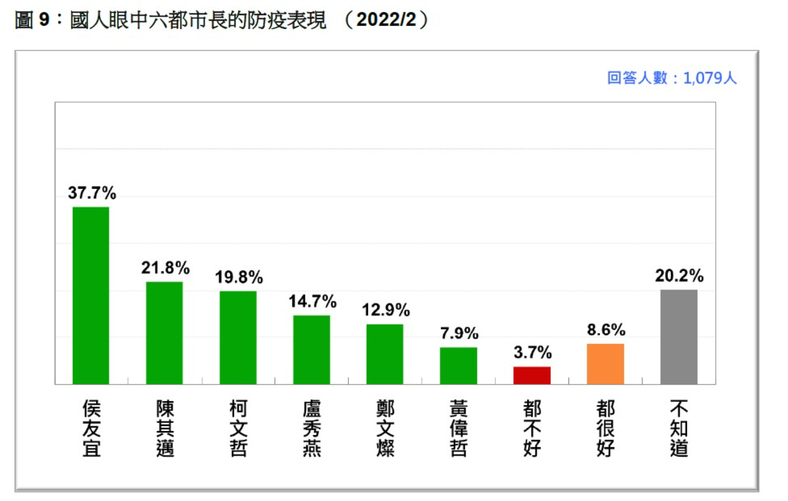 年初疫情再起,各縣市紛紛傳出本土病例,近來已有趨緩跡象。台灣民意基金會分析國人眼中的六都市長防疫表現,新北市長侯友宜持續居冠,肯定度達37.7%,高雄市長陳其邁則躍居第二拿下21.8%,次之為台北市長柯文哲的19.8%,後兩者名次互換。台中市長盧秀燕、桃園市長鄭文燦皆在一成左右,台南市長黃偉哲以7.9%敬陪末座。