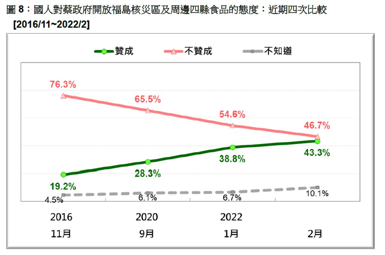 2月8日福島食品宣布解禁,引發不少反彈聲浪。民調結果顯示約四成三民眾贊成蔡政府開放,四成七不贊成,兩者相距3.4個百分點,正反意見旗鼓相當。