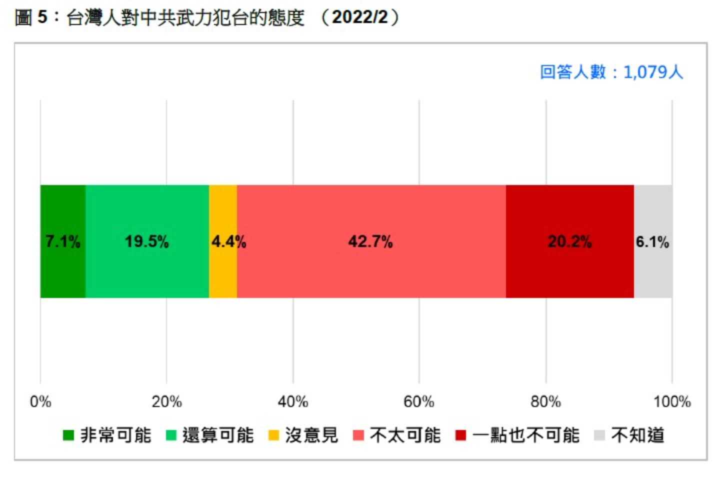 亦有傳聞指出,若俄烏開戰,中共恐會趁機對台灣發動戰爭。高達六成三民眾認為不可能,泛藍、泛綠群眾也罕見存在共識。年齡層方面,以55歲為分野,青壯世代對危機意識較強,但多數仍抱持老神在在的態度。游盈隆表示,儘管兩年來共機多次擾台、航母戰鬥群亦曾繞台演訓,英國《經濟學人》雜誌還曾形同「台灣是地表最危險的地方」,但絕大多數台灣人似乎並無感覺。他擔憂,究竟是因為台灣人「不是被阿共嚇大的」,還是「溫水煮青蛙」讓多數人早已習慣?