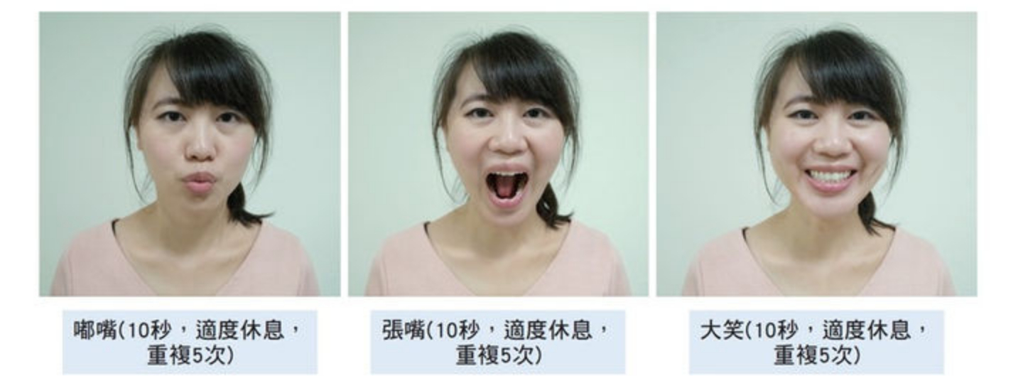 a. 唇臉運動:嘟嘴做出「屋」的口形、張大口做出「阿」的口形、抿嘴唇、微笑,咧嘴笑、鼓雙頰(像要吹氣球)等動作。練習發音,如ㄅ、ㄆ等音(可對著鏡子練習)。