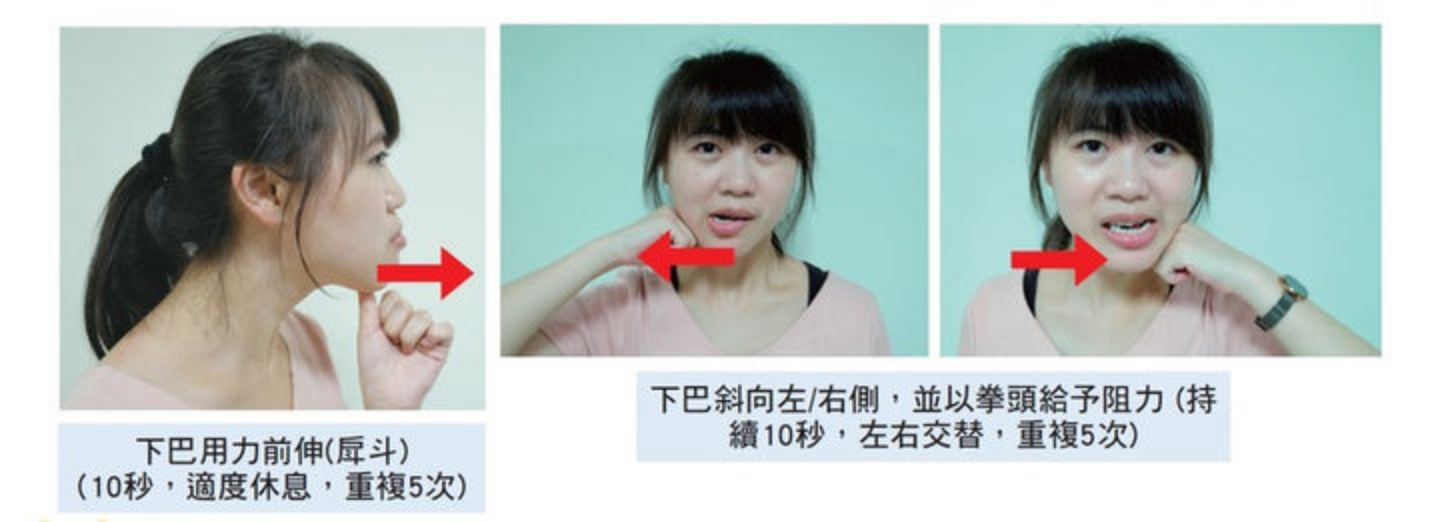 b. 顳顎關節運動:下巴向左右兩側移動、下顎向前移動(戽斗動作)、嘴巴用力張開。
